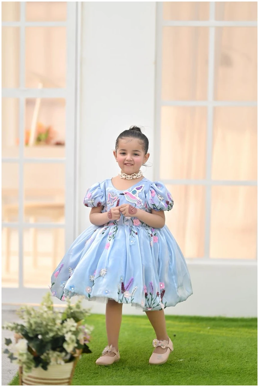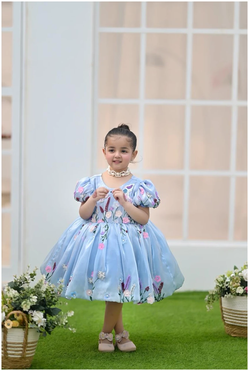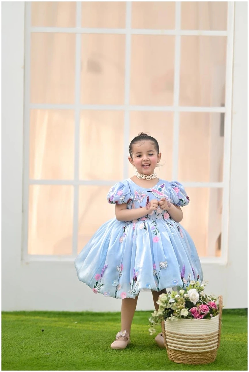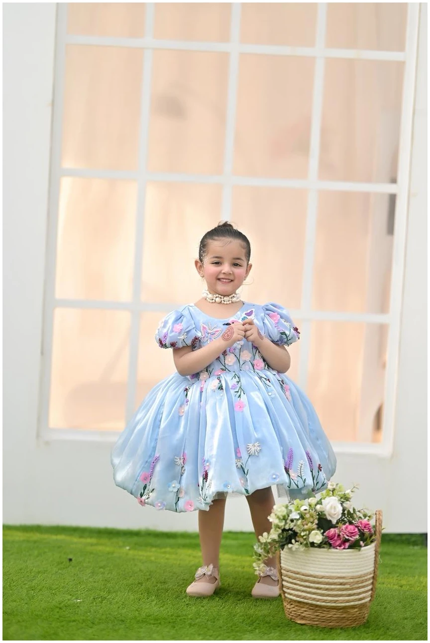 Let your little one shine in our Bluebell Fairy Dress, designed to capture pure elegance and childhood charm. Crafted in a soft sky-blue hue, this dress features delicate 3D floral embroidery with pastel blossoms and butterfly accents, creating a dreamy fairytale look.