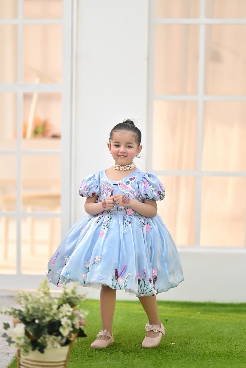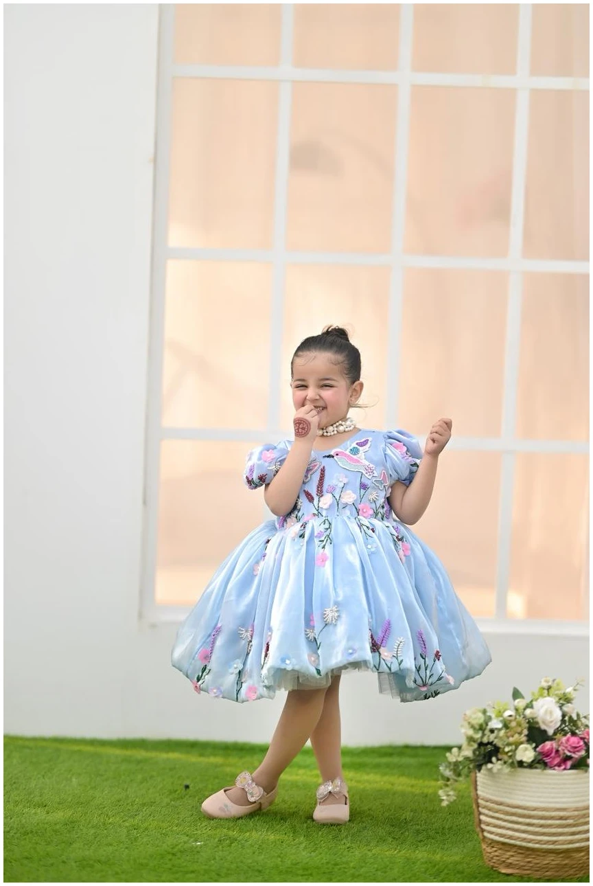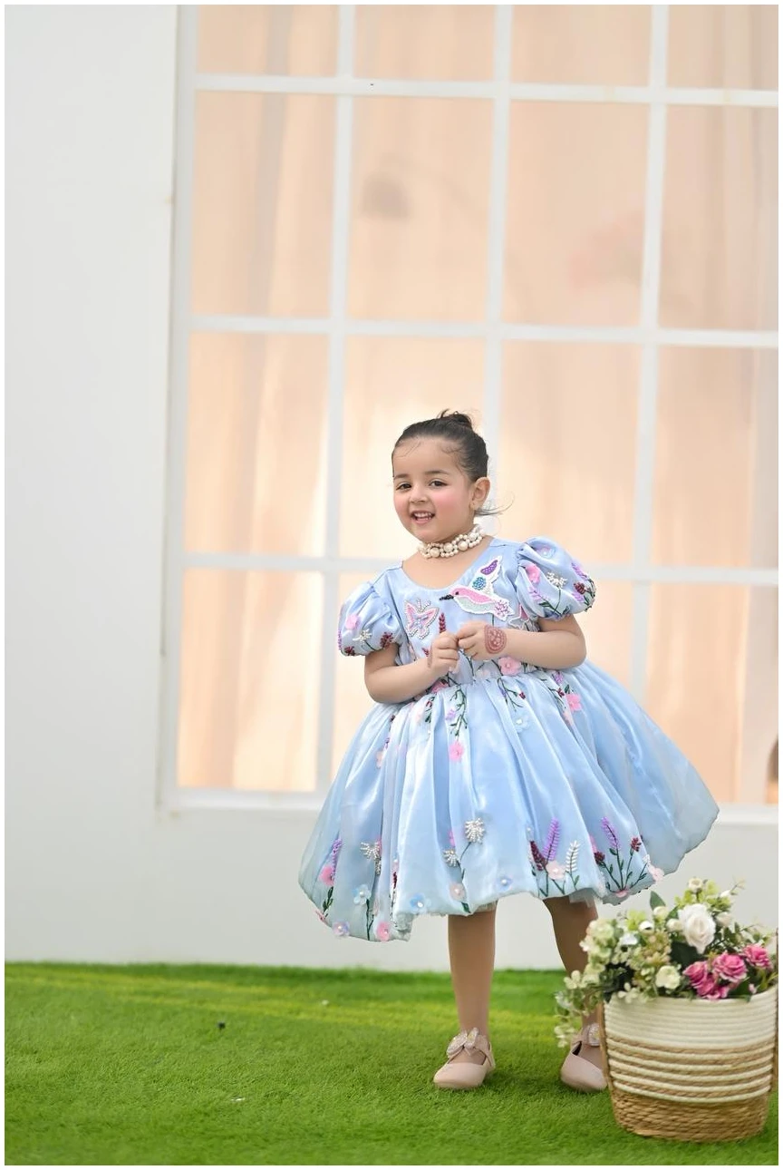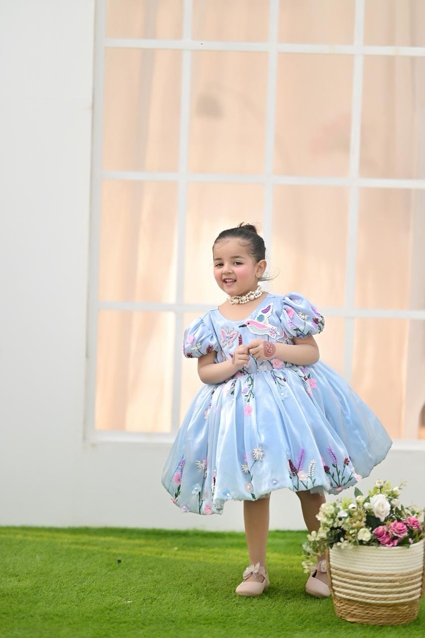 Let your little one shine in our Bluebell Fairy Dress, designed to capture pure elegance and childhood charm. Crafted in a soft sky-blue hue, this dress features delicate 3D floral embroidery with pastel blossoms and butterfly accents, creating a dreamy fairytale look.