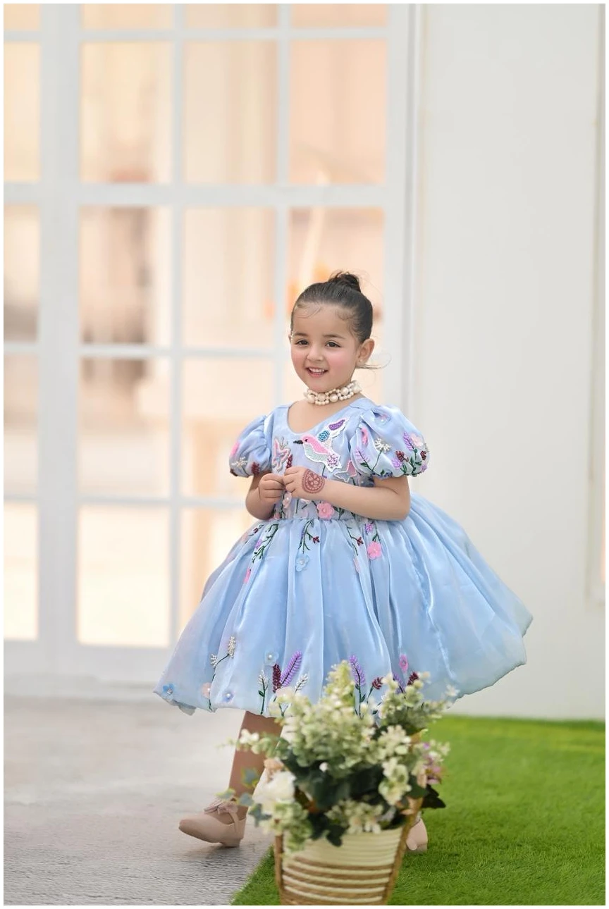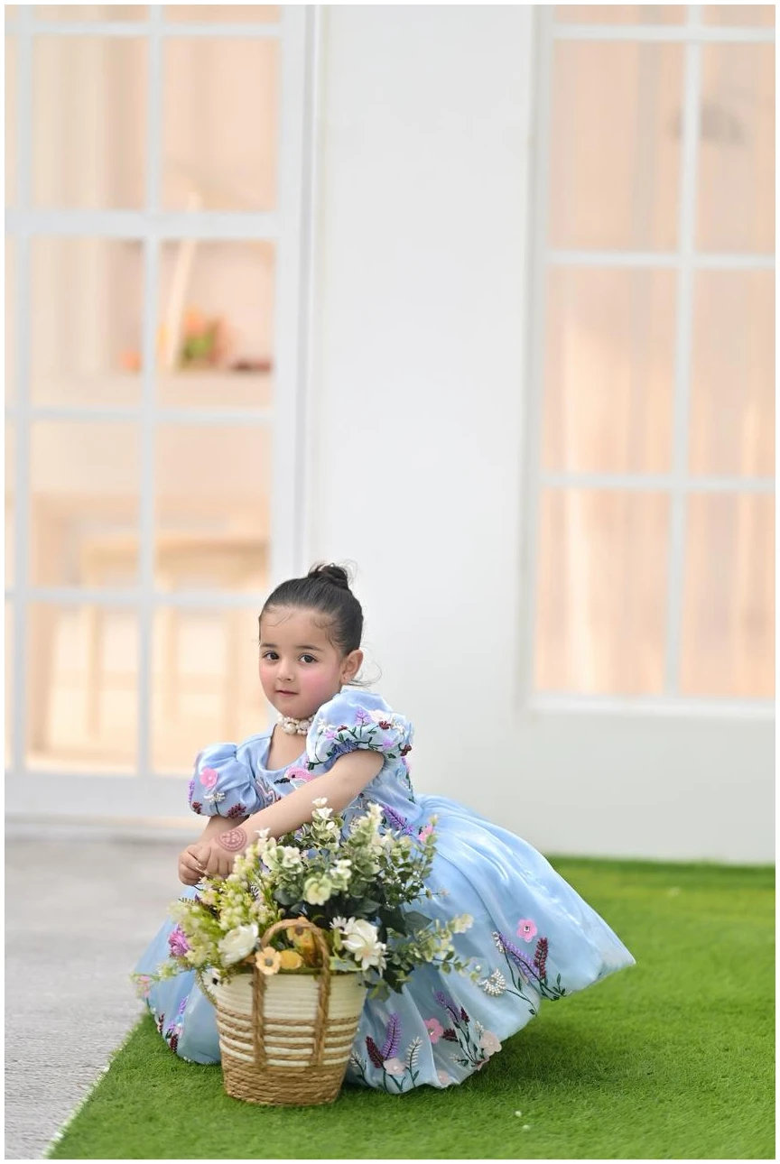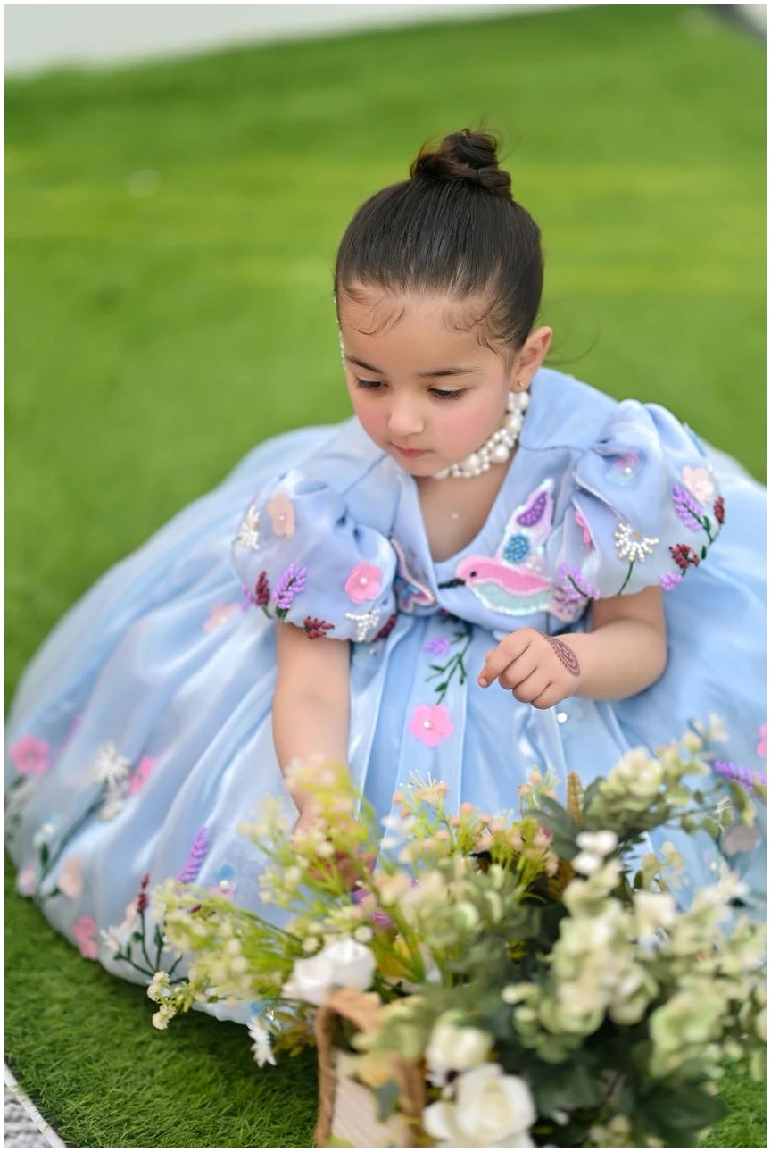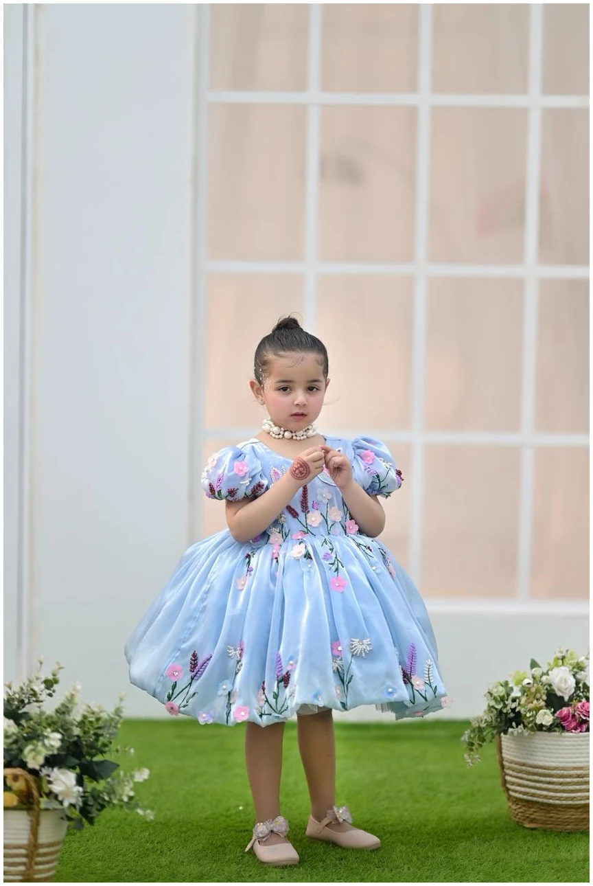 Let your little one shine in our Bluebell Fairy Dress, designed to capture pure elegance and childhood charm. Crafted in a soft sky-blue hue, this dress features delicate 3D floral embroidery with pastel blossoms and butterfly accents, creating a dreamy fairytale look.
