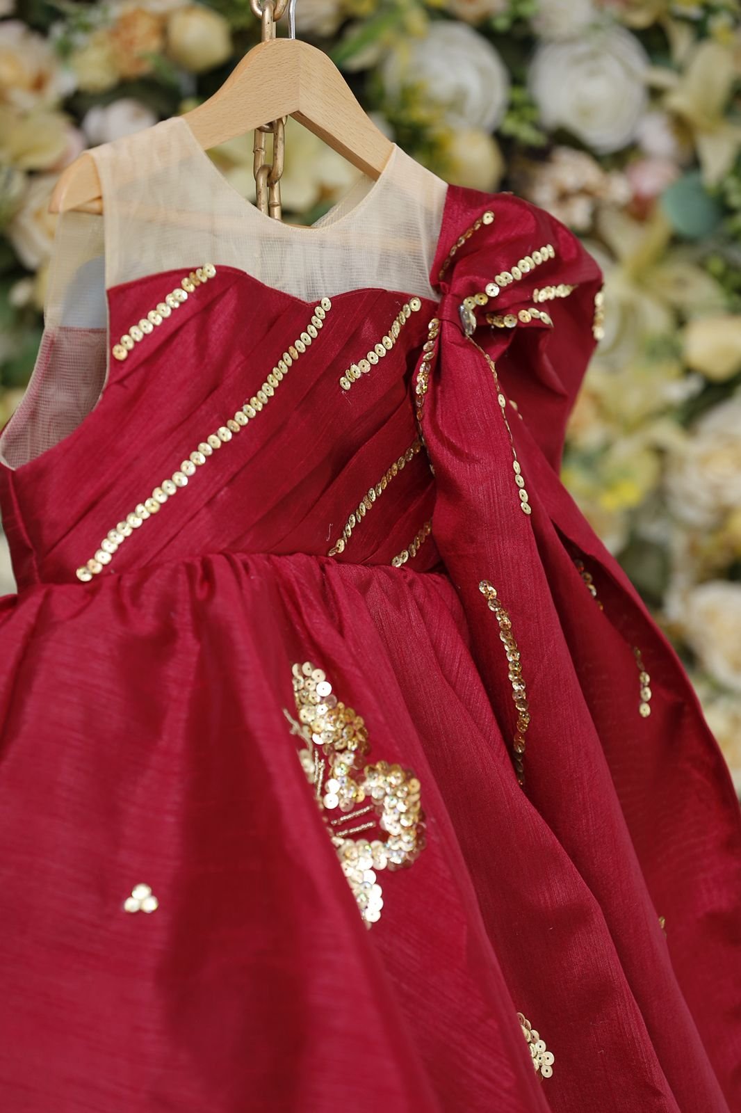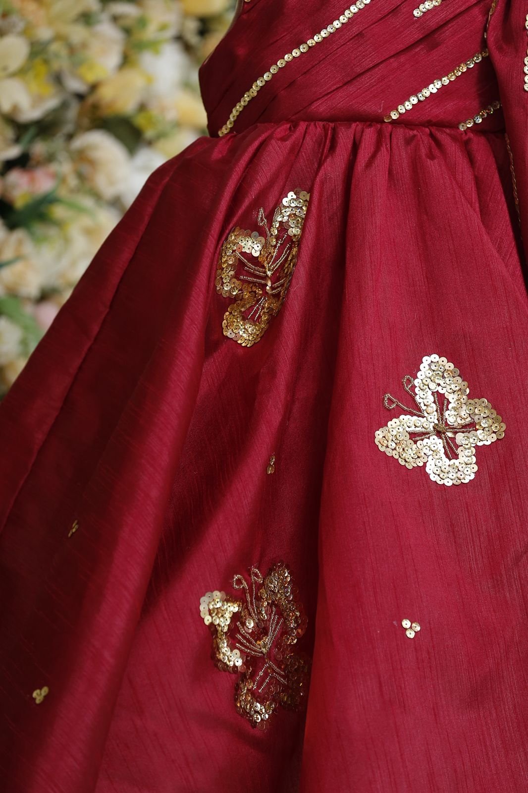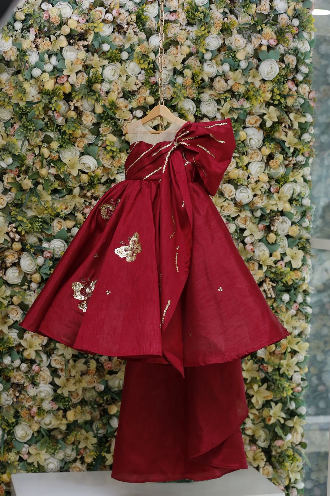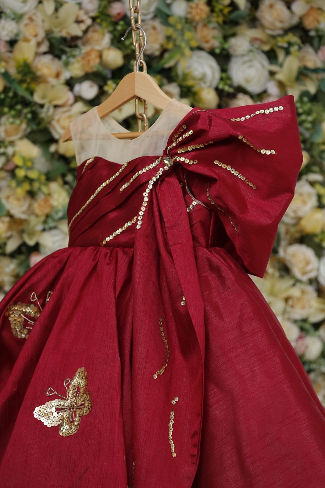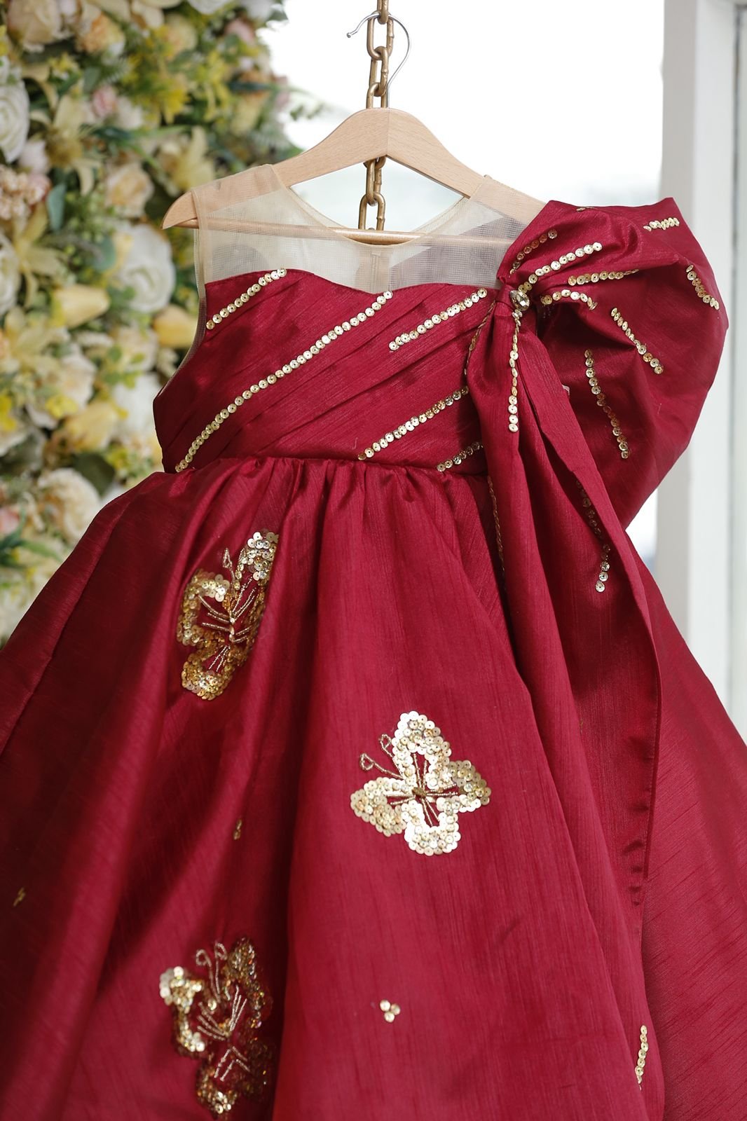 This raw silk tail dress is a masterpiece, with intricate sequin embroidery and a beautiful butterfly design. The front puff adds a touch of elegance, making it perfect for any special occasion! ππ»β¨