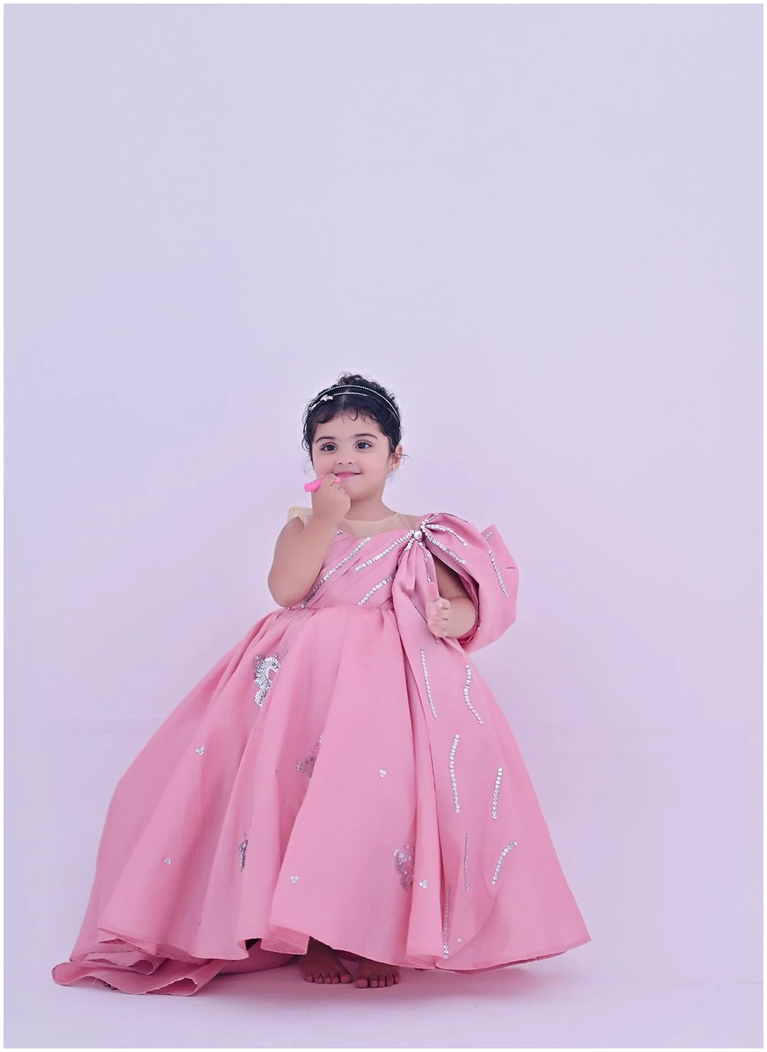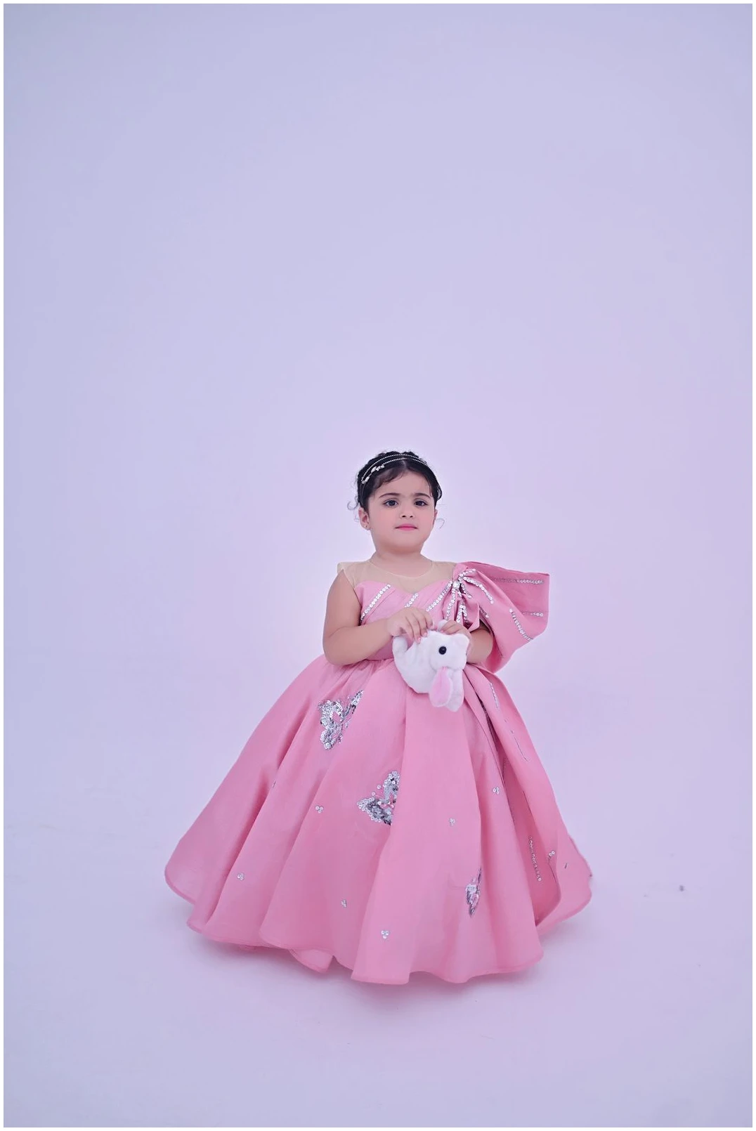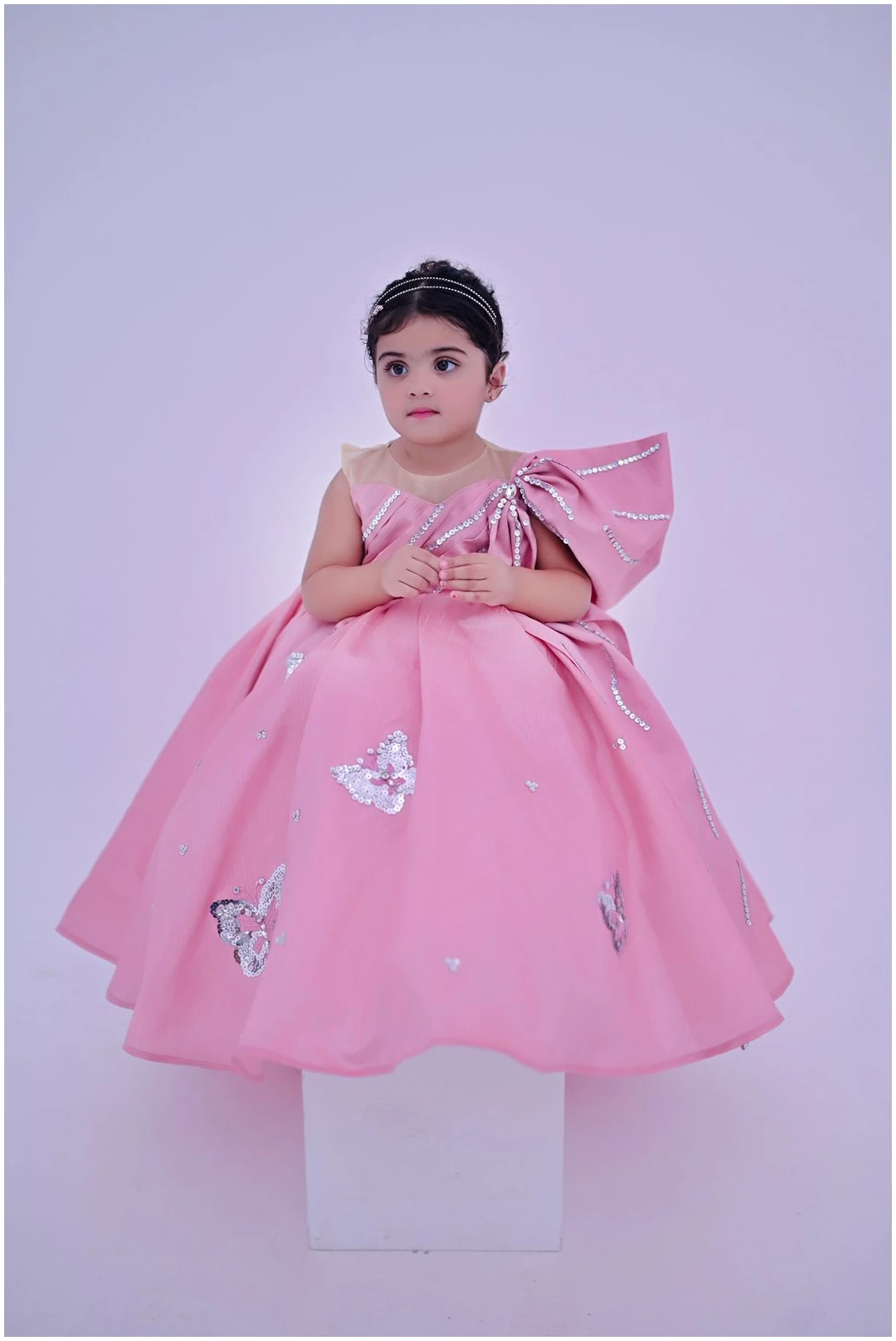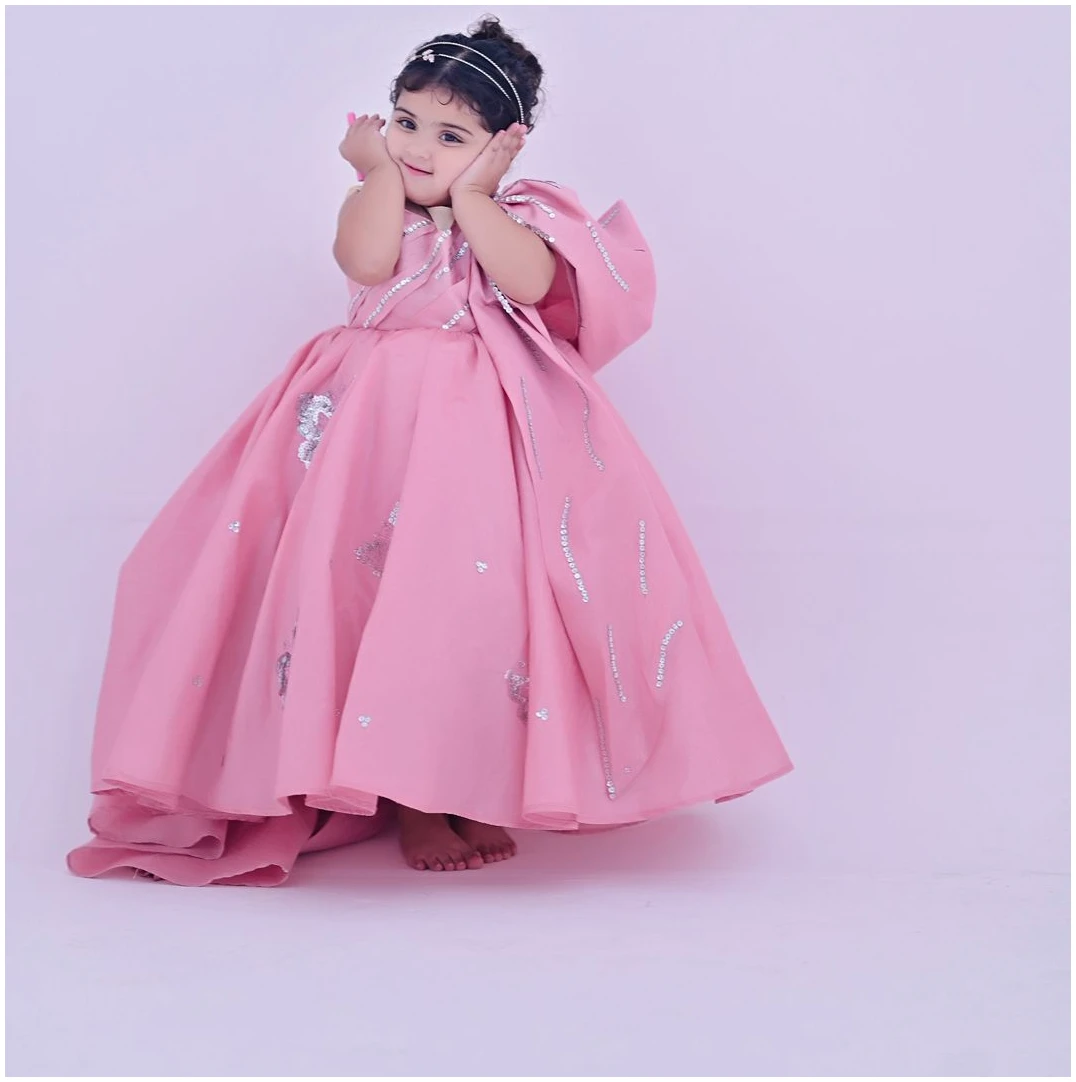 This raw silk tail dress is a masterpiece, with intricate sequin embroidery and a beautiful butterfly design. The front puff adds a touch of elegance, making