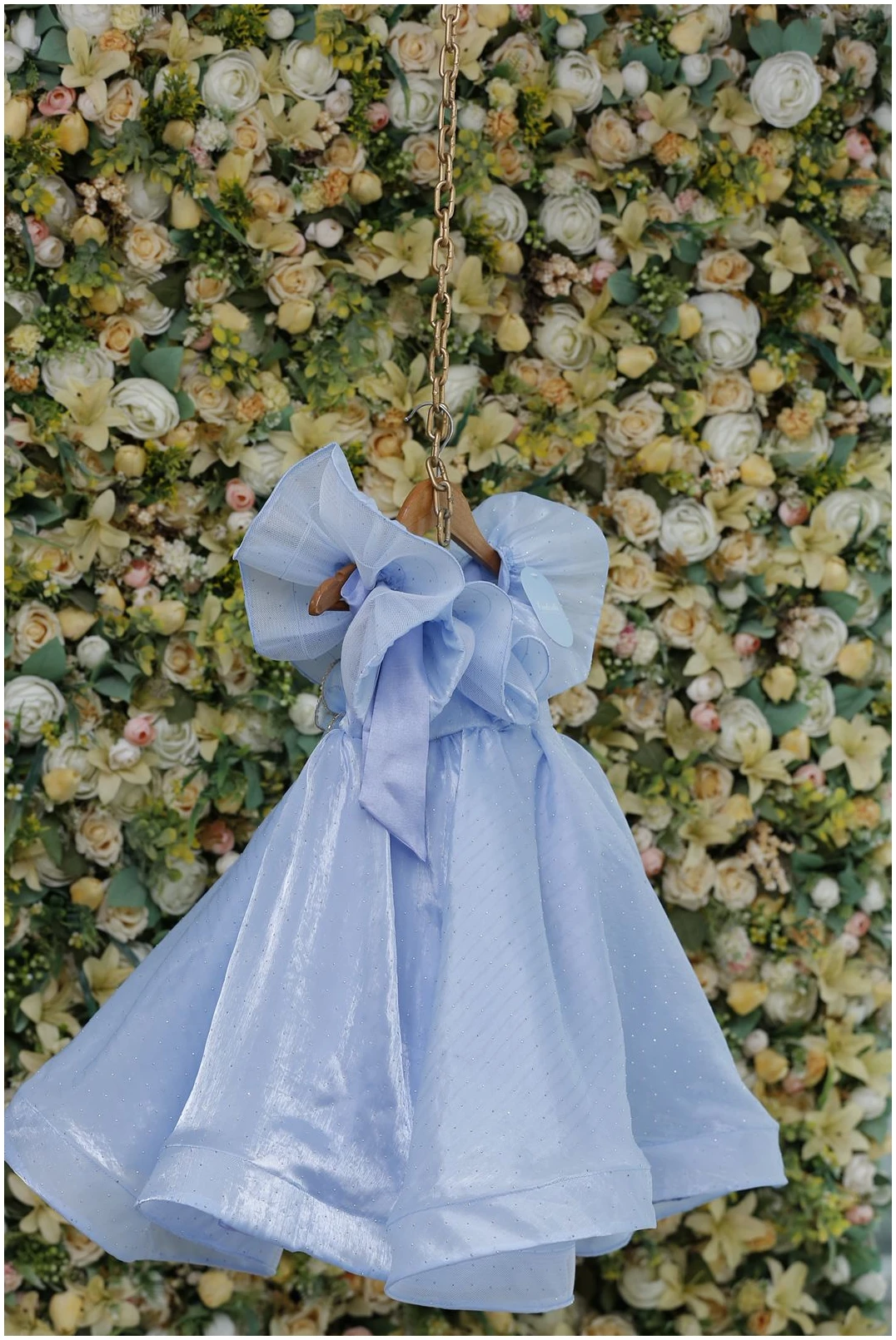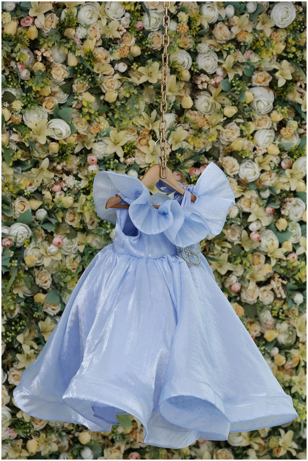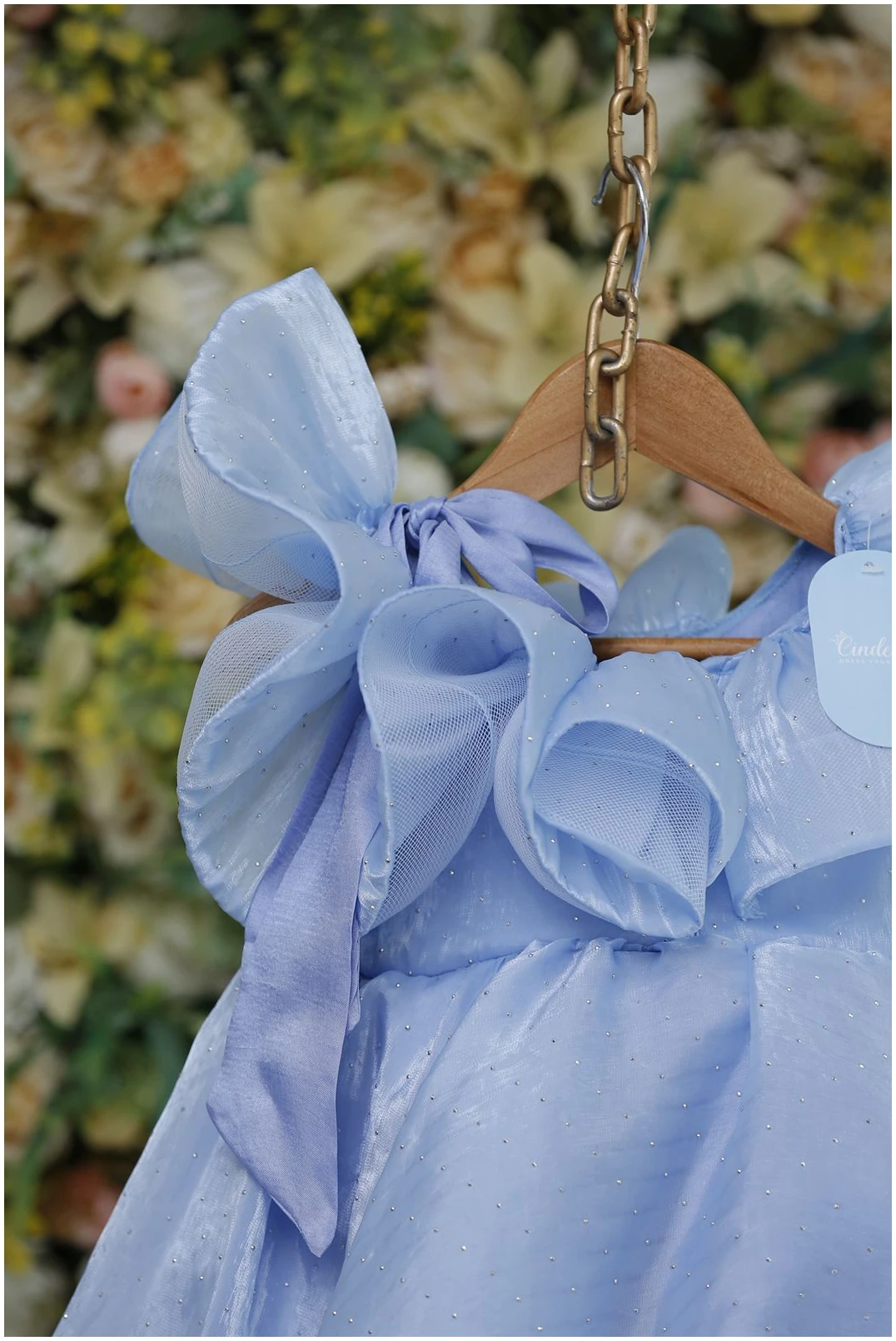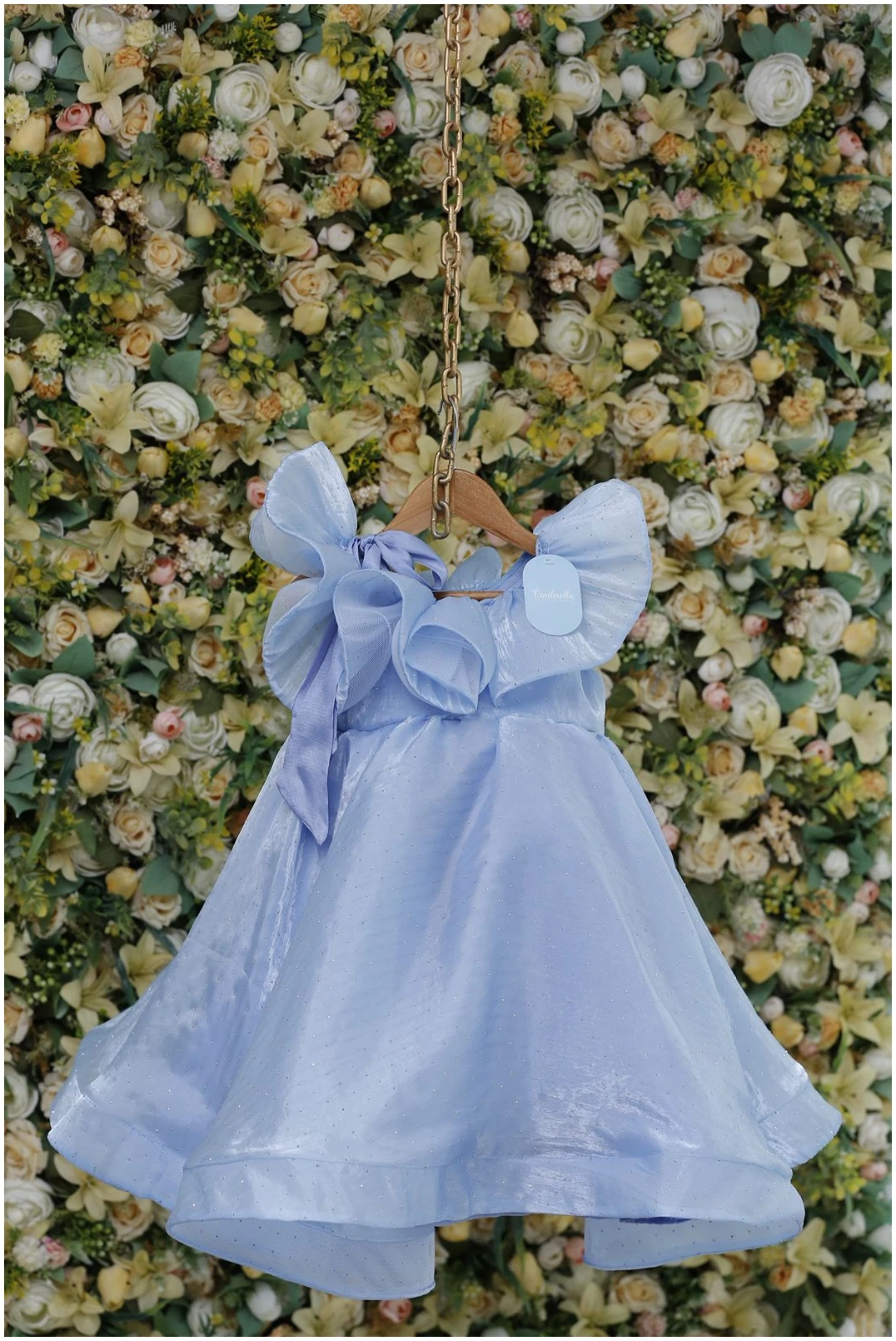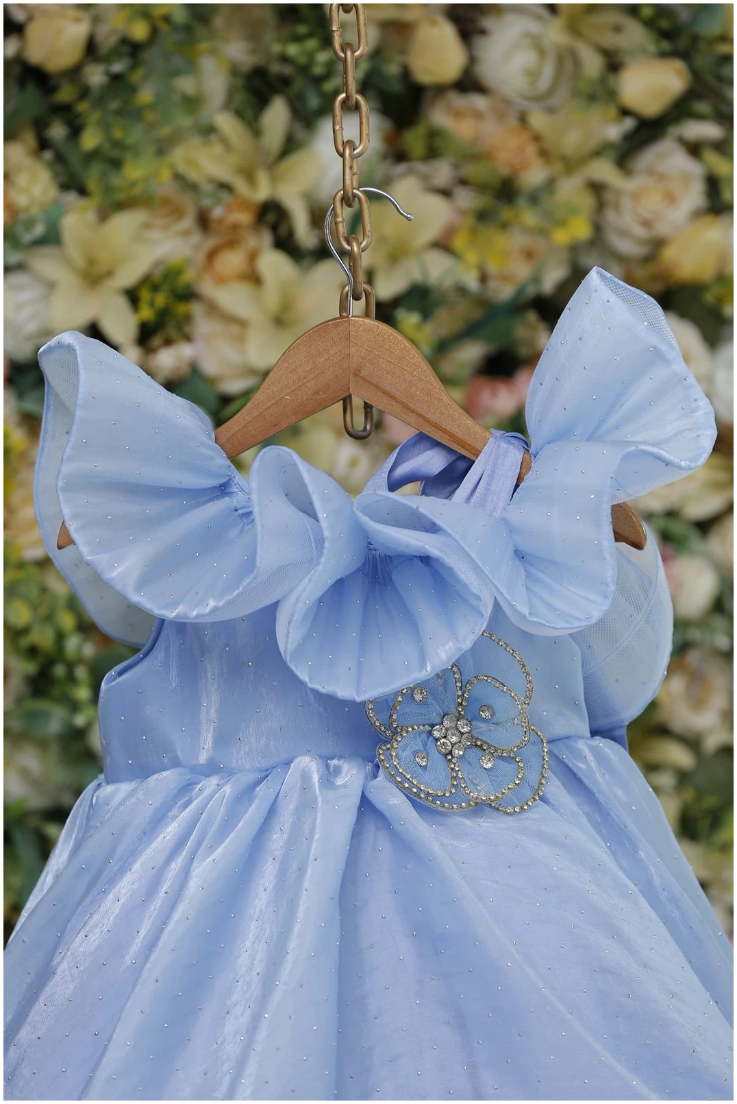 Turn your little one into a fairytale princess with this enchanting sky-blue frock. Designed with a shimmering fabric that sparkles with every twirl, this dress features oversized ruffled shoulders and a delicate crystal-embellished butterfly motif at the waist. The voluminous skirt adds a touch of royal charm, making it the perfect choice for birthdays, weddings, and special celebrations.