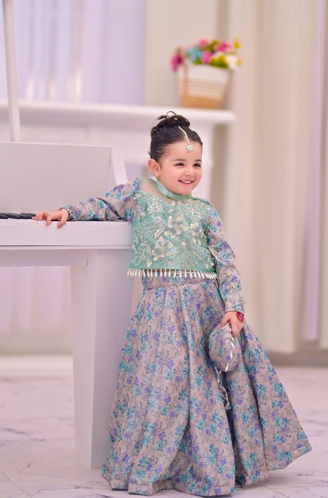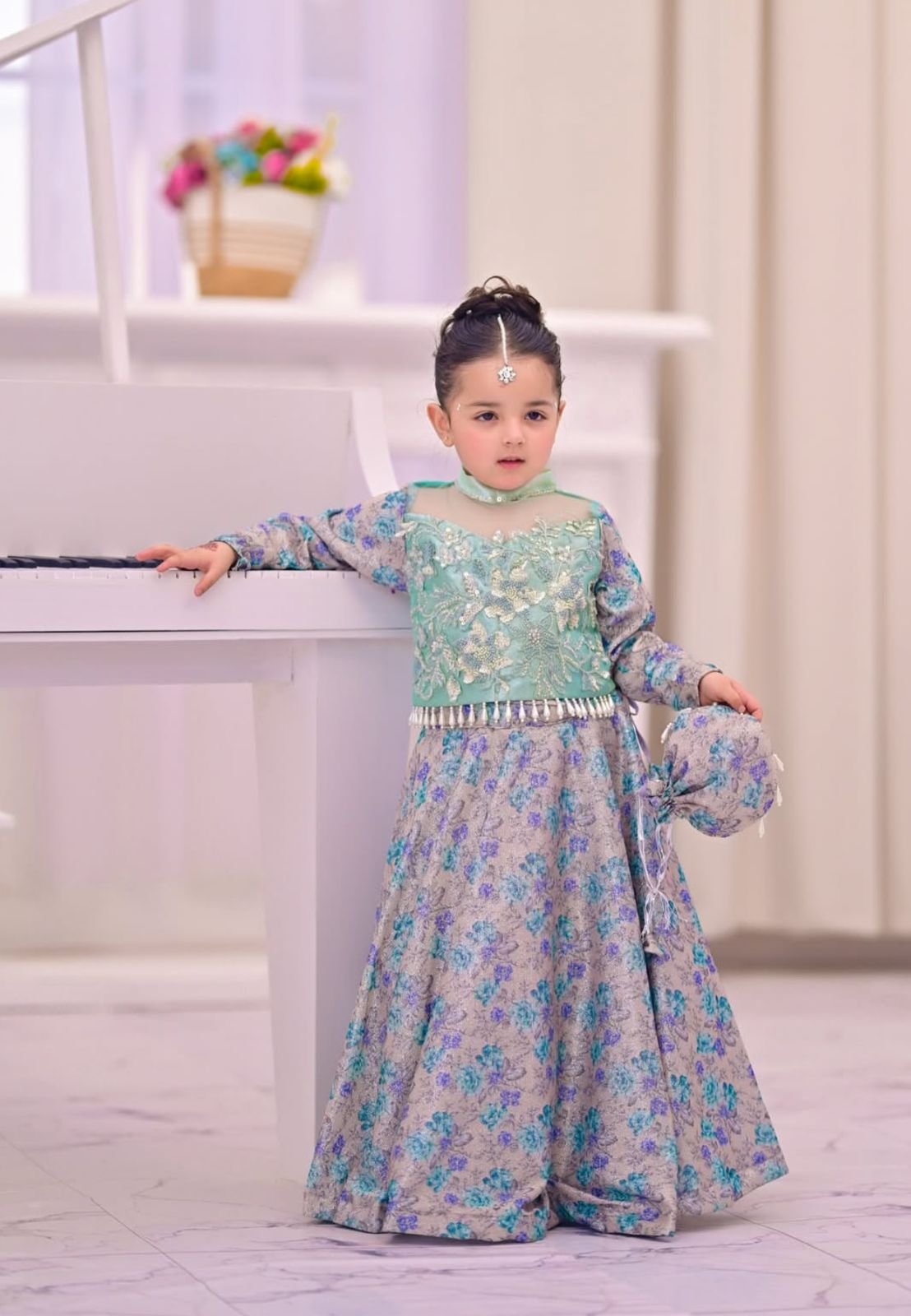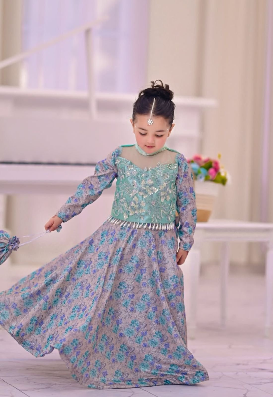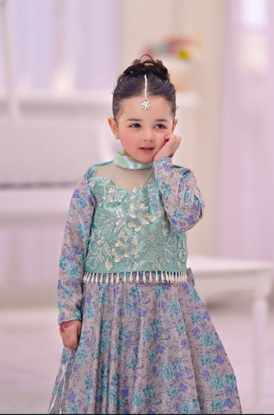Add a touch of royalty to your little one’s festive wardrobe with this exquisite mint blossom lehenga set. The beautifully embroidered bodice is adorned with delicate floral patterns and shimmering sequins, paired with sheer full sleeves for a graceful finish. The flowing pastel floral skirt creates a dreamy silhouette, perfect for twirls and special moments.