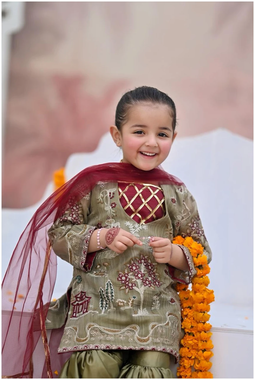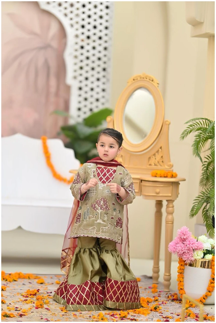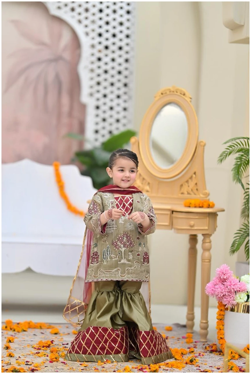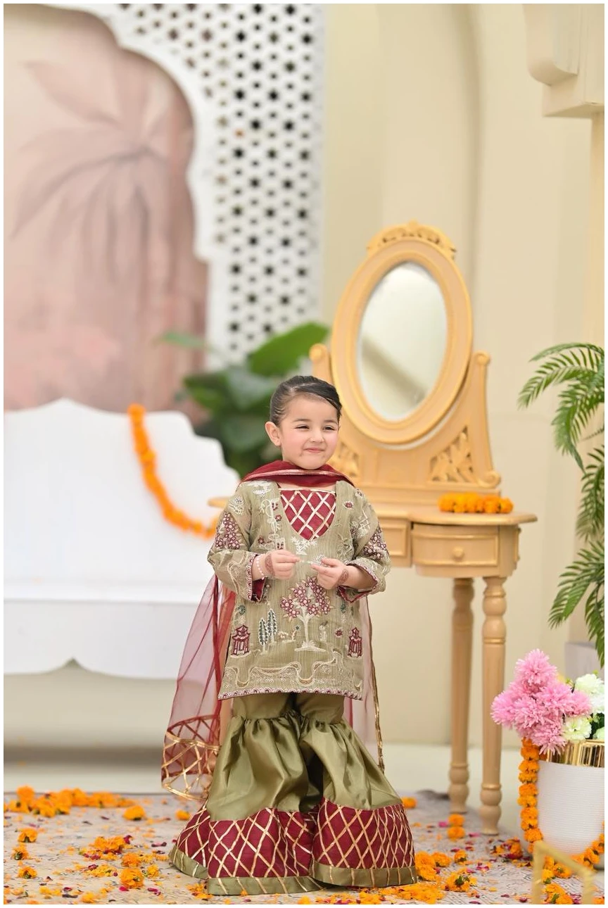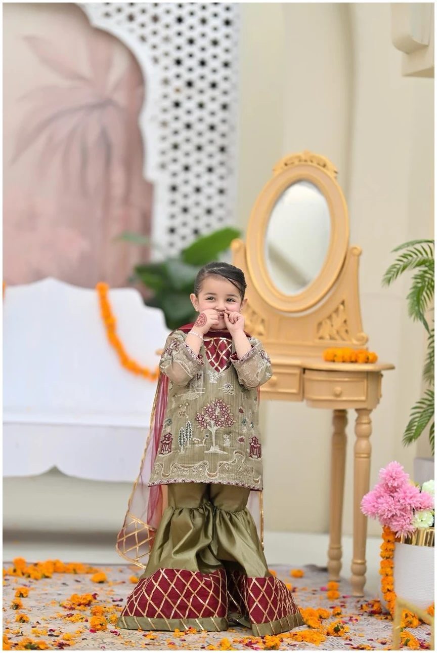 Celebrate tradition with elegance in our Gull bhag, thoughtfully designed for little ones to shine at festive occasions. This charming outfit features an olive-toned embroidered kurta adorned with intricate threadwork and delicate motifs, beautifully paired with a statement gharara detailed with rich maroon accents and geometric patterns.
