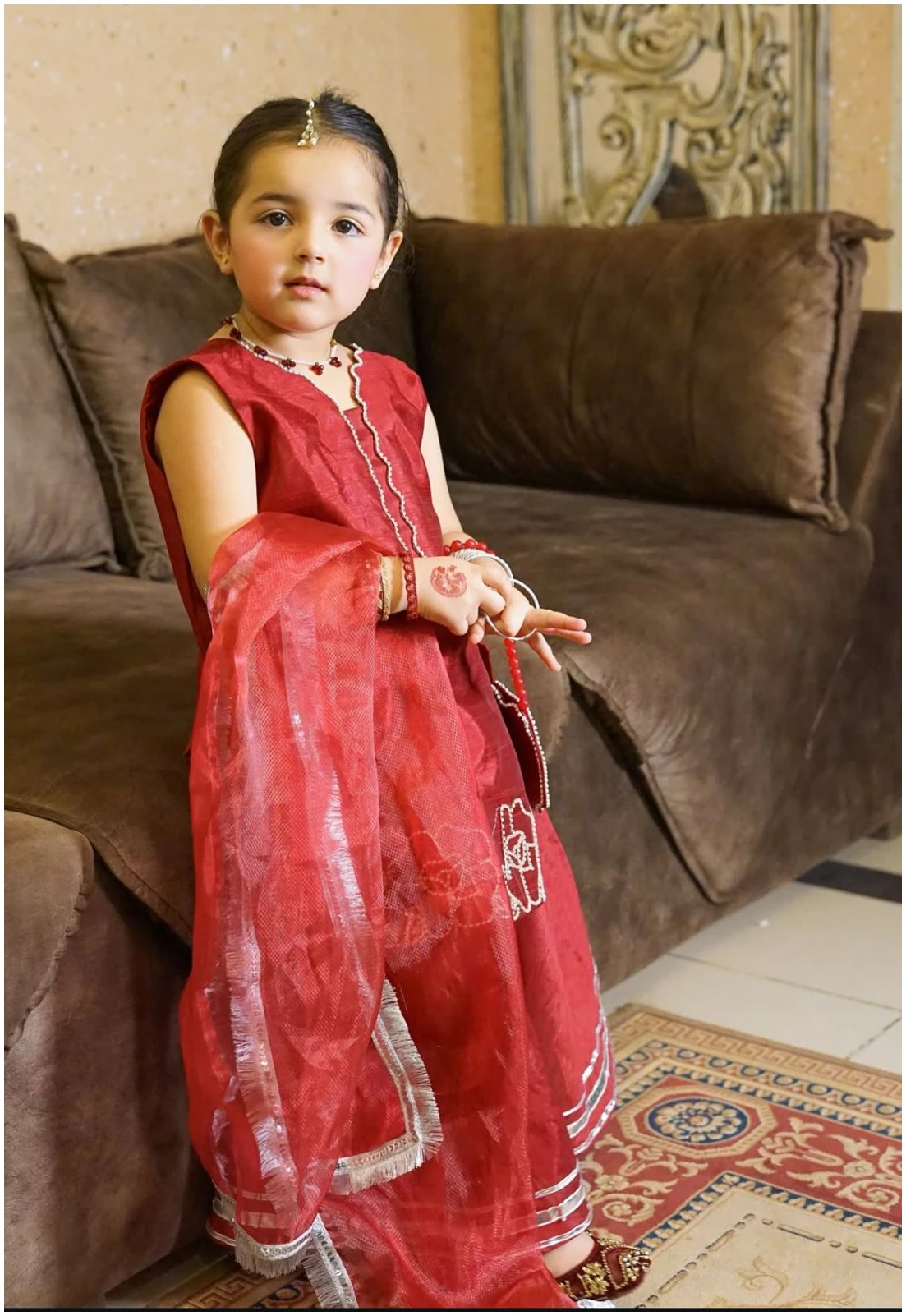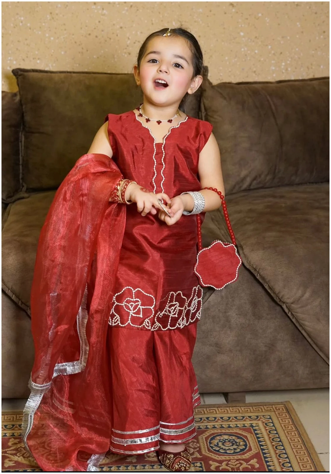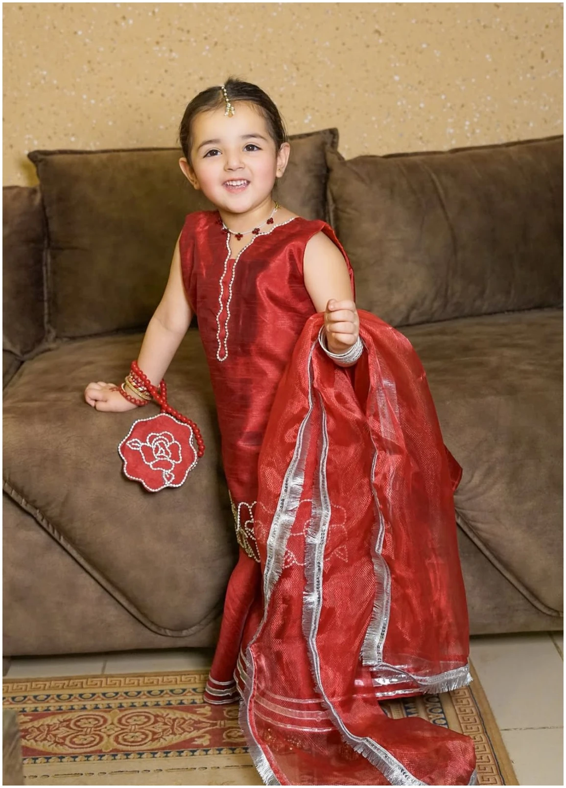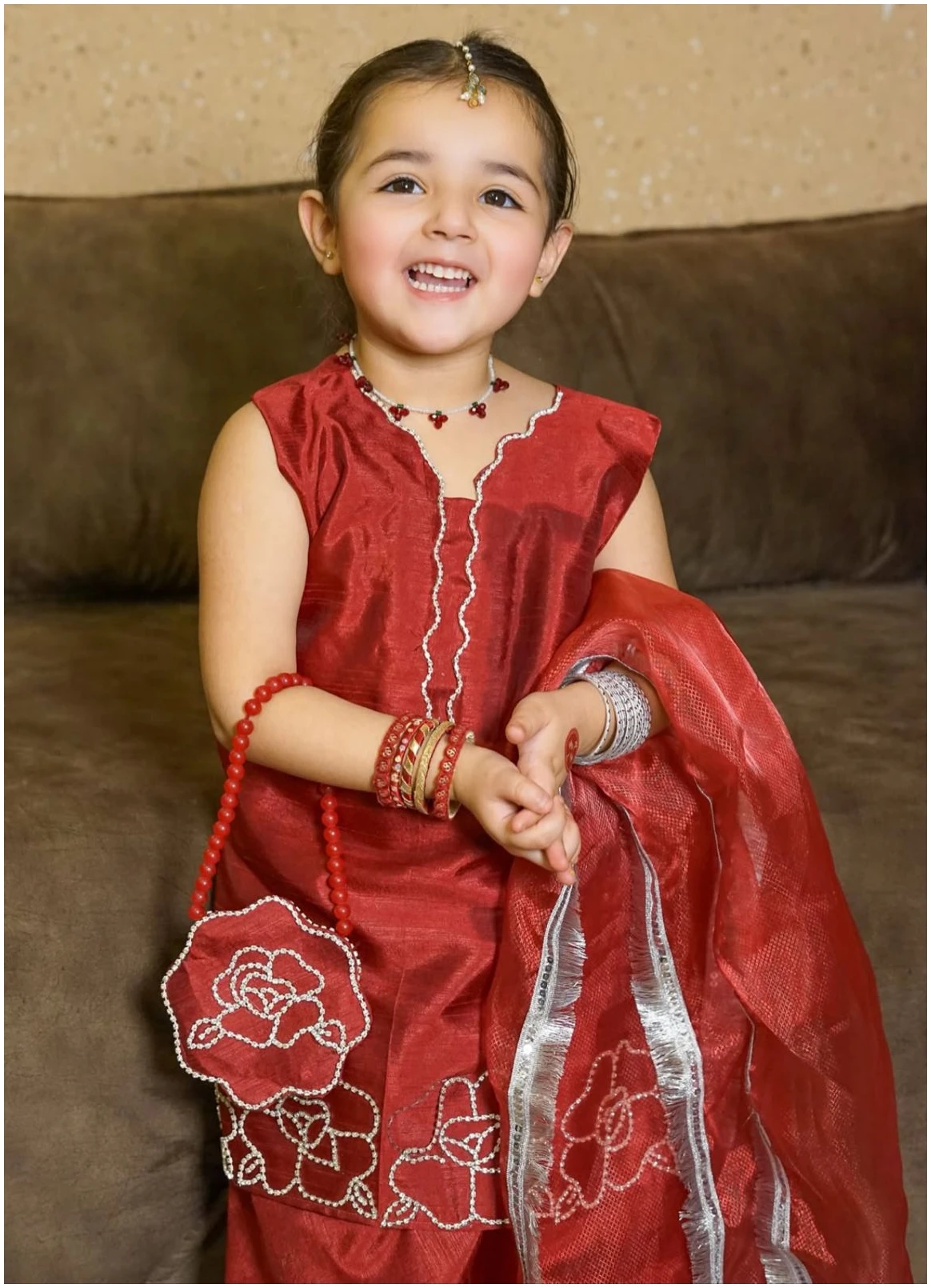 Bring charm and tradition together with this elegant maroon shalwar kameez for girls. Designed with delicate bead embroidery in floral patterns, this outfit is paired with a matching dupatta trimmed in silver lace, giving it a festive and graceful look. The set also includes a cute matching pouch, adding a fun and stylish touch for your little one.