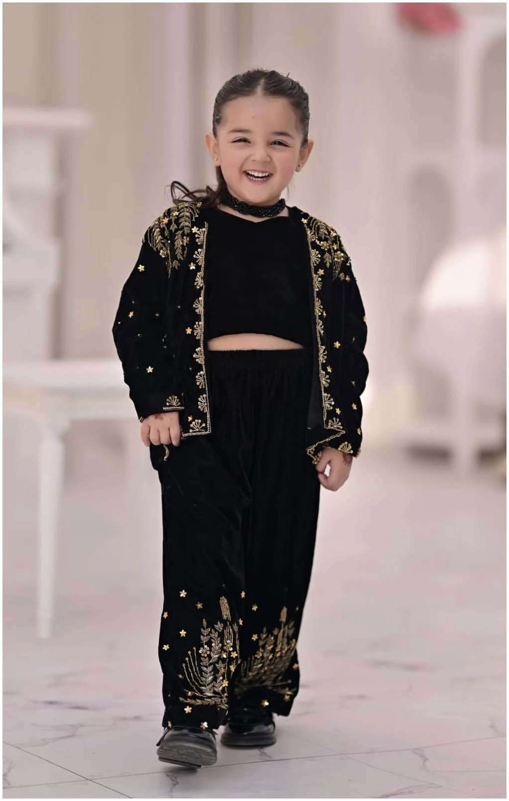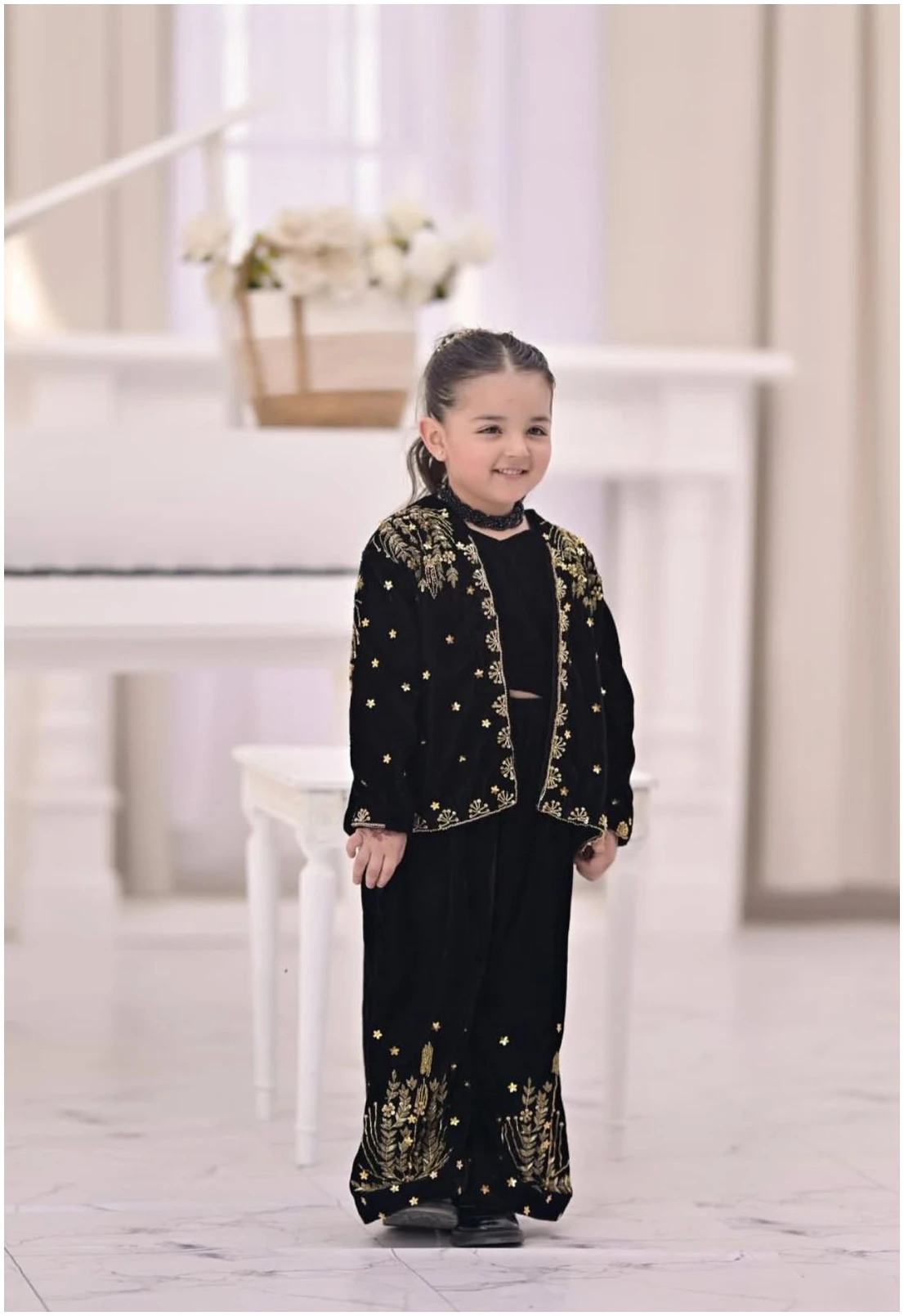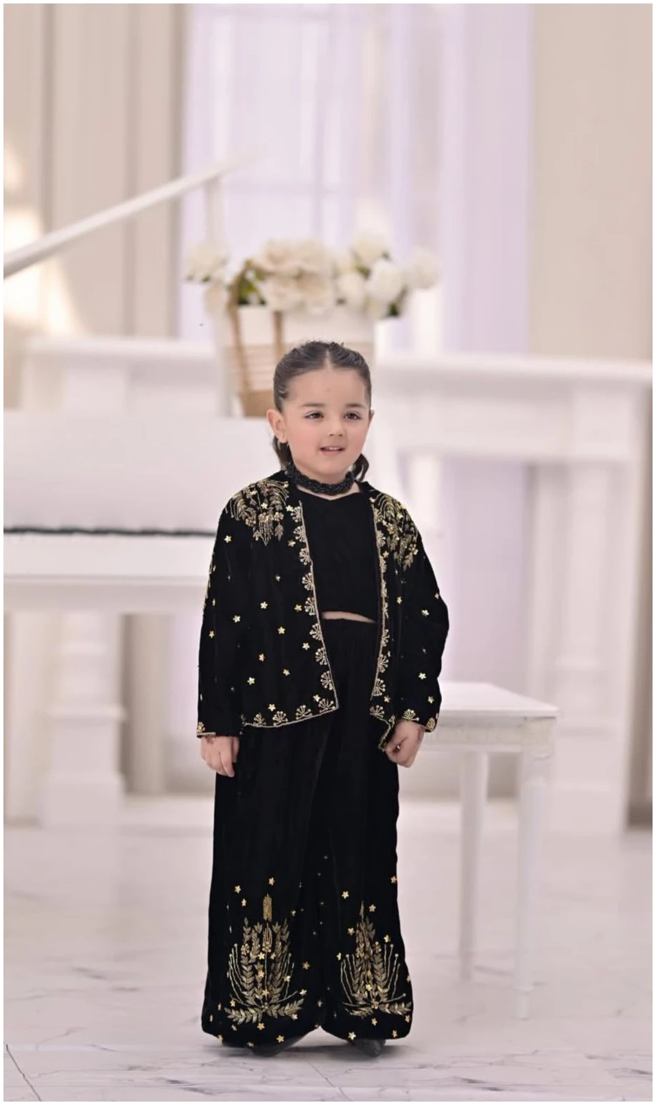 Introduce timeless elegance to your little one’s wardrobe with our Black Velvet Embroidered Three-Piece Set. Crafted from premium soft velvet, this outfit features a chic crop top paired with wide-leg plazo pants, finished with intricate gold thread embroidery that adds a touch of festive charm.