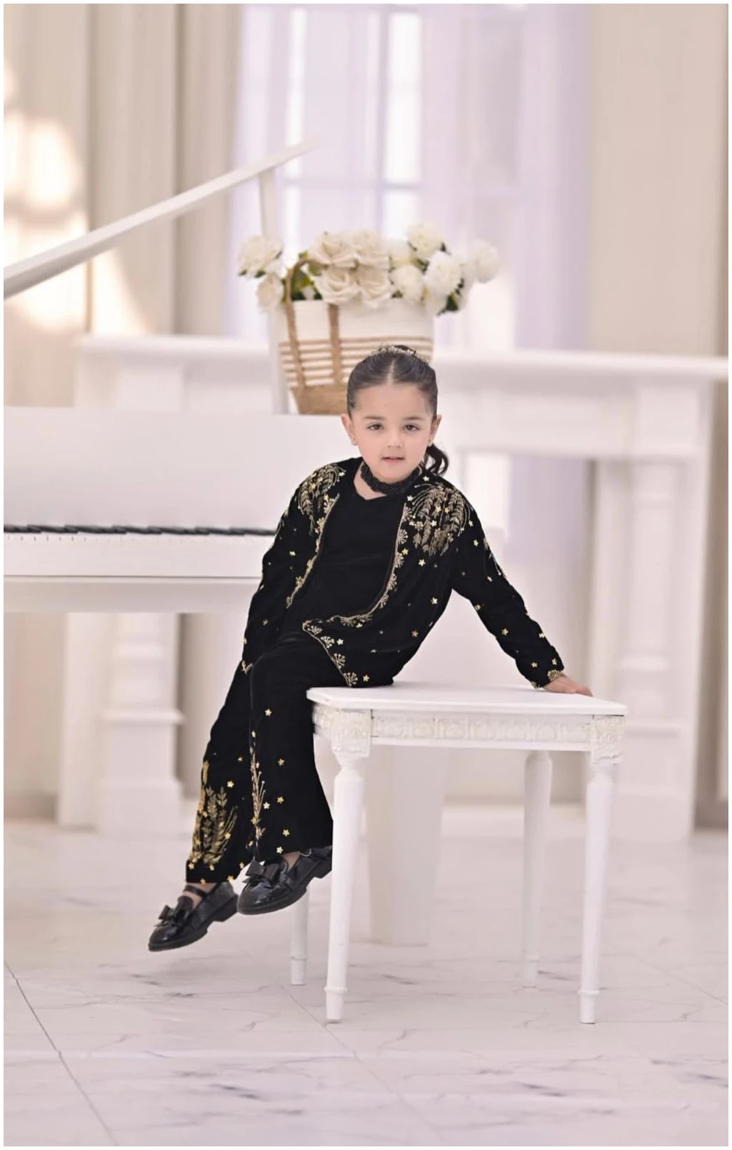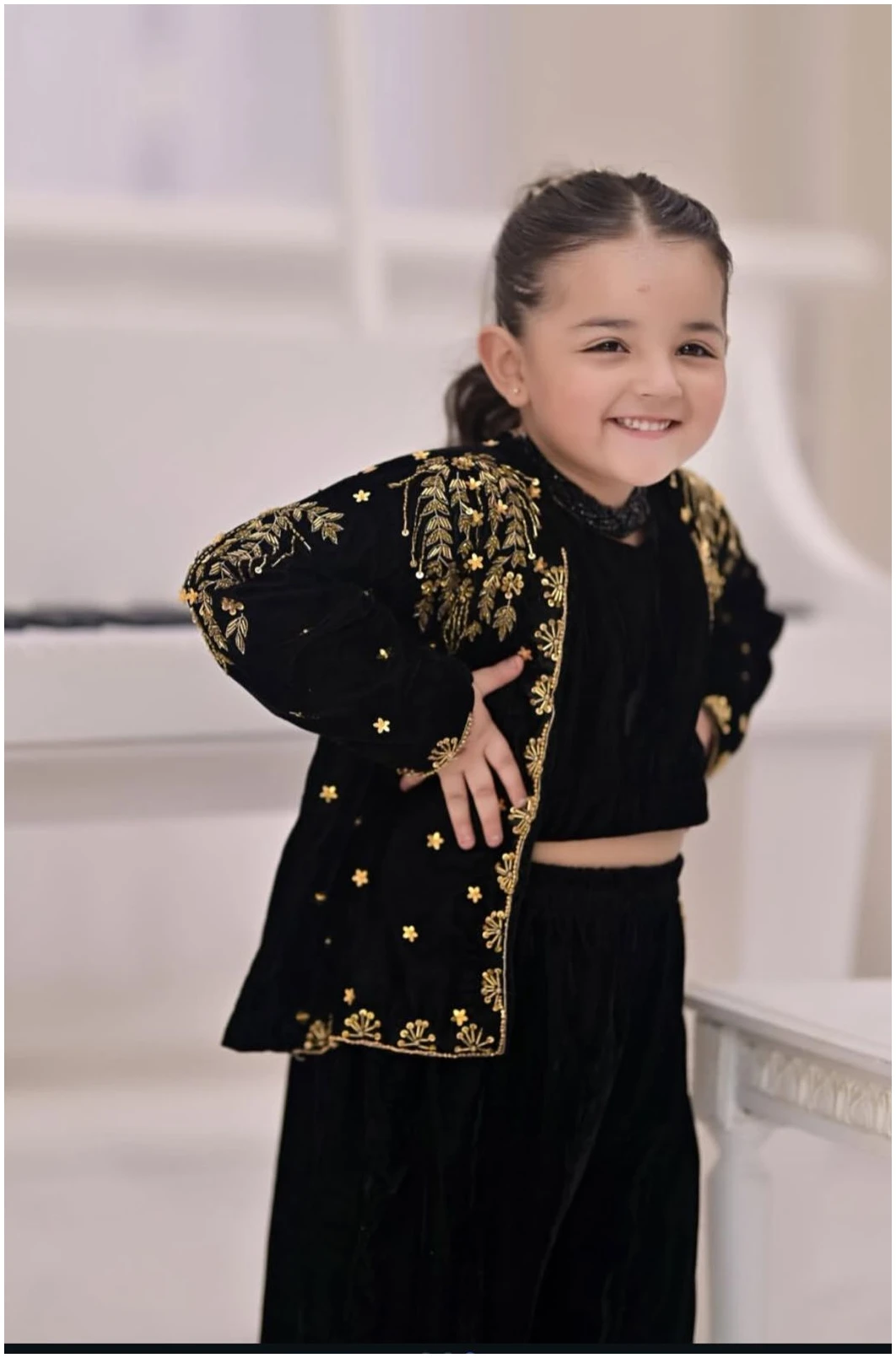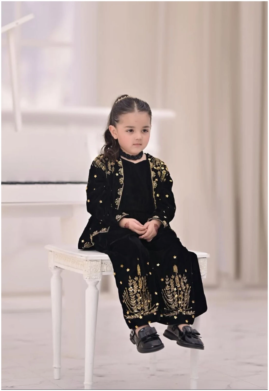 Introduce timeless elegance to your little one’s wardrobe with our Black Velvet Embroidered Three-Piece Set. Crafted from premium soft velvet, this outfit features a chic crop top paired with wide-leg plazo pants, finished with intricate gold thread embroidery that adds a touch of festive charm.