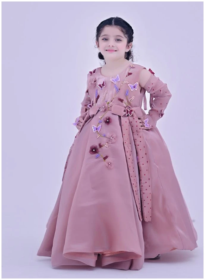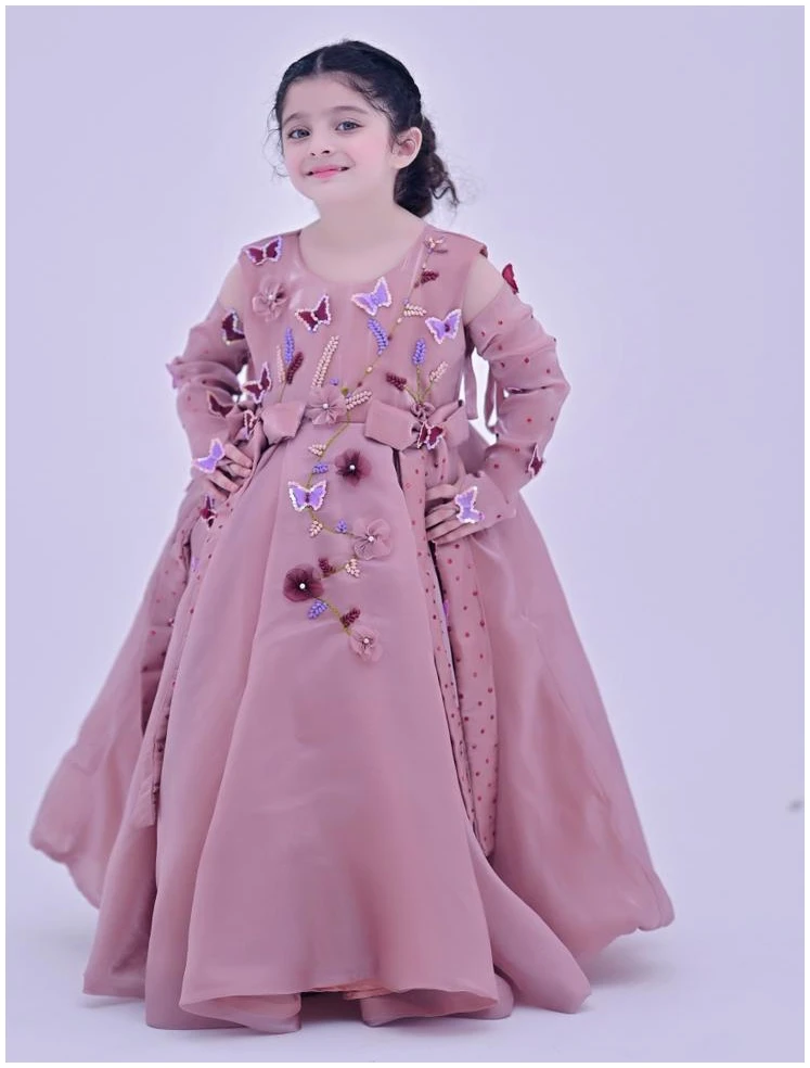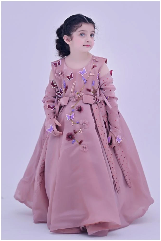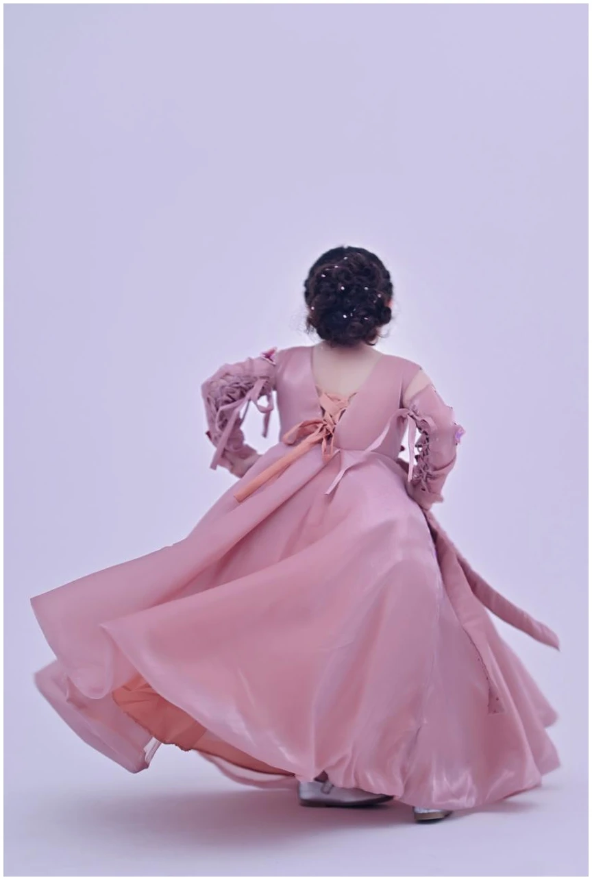 Korean silk, delicate embroidery, and butterfly details make this fairy frock a masterpiece. Paired with pink shiny gloves for a touch of sophistication 💅🏻