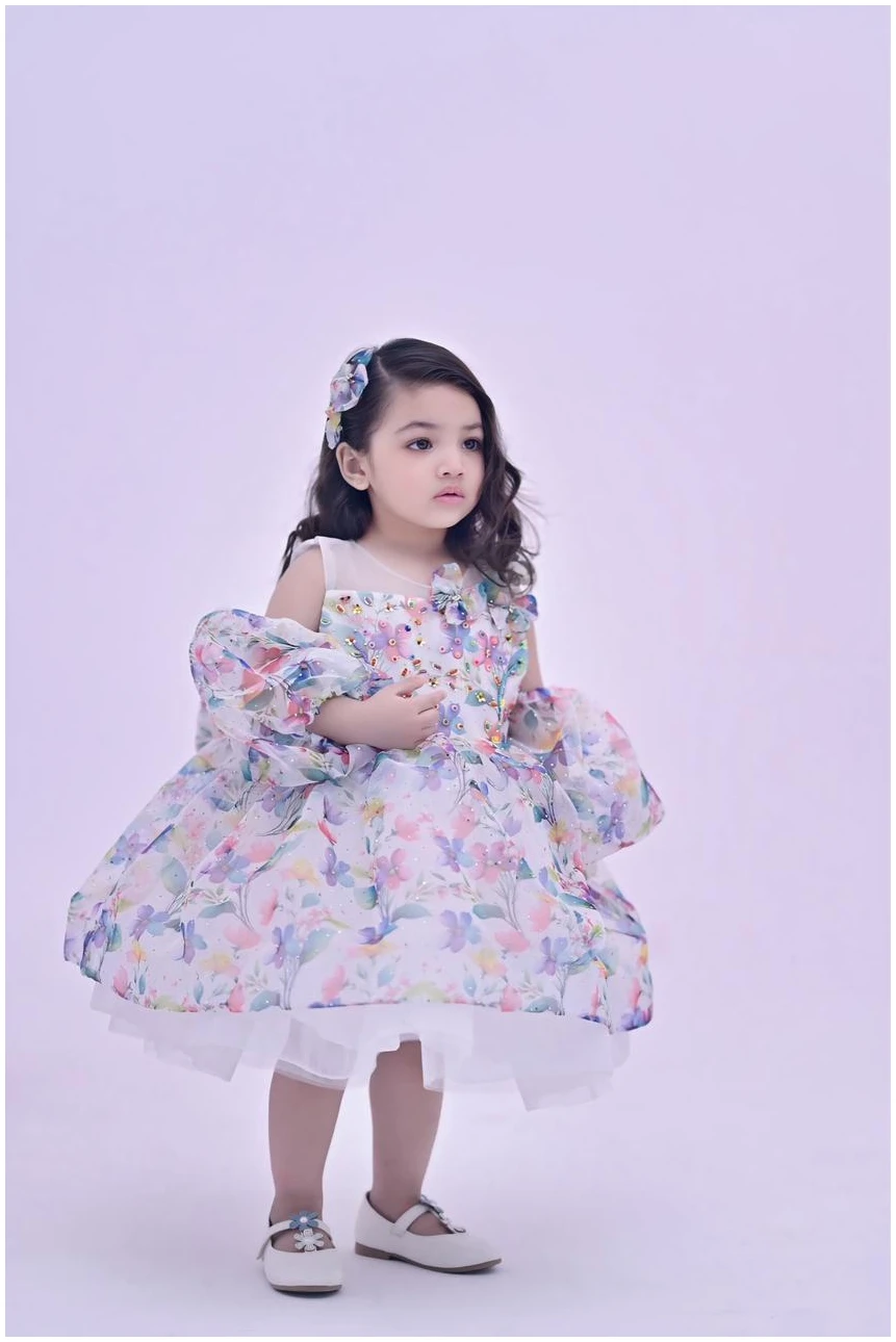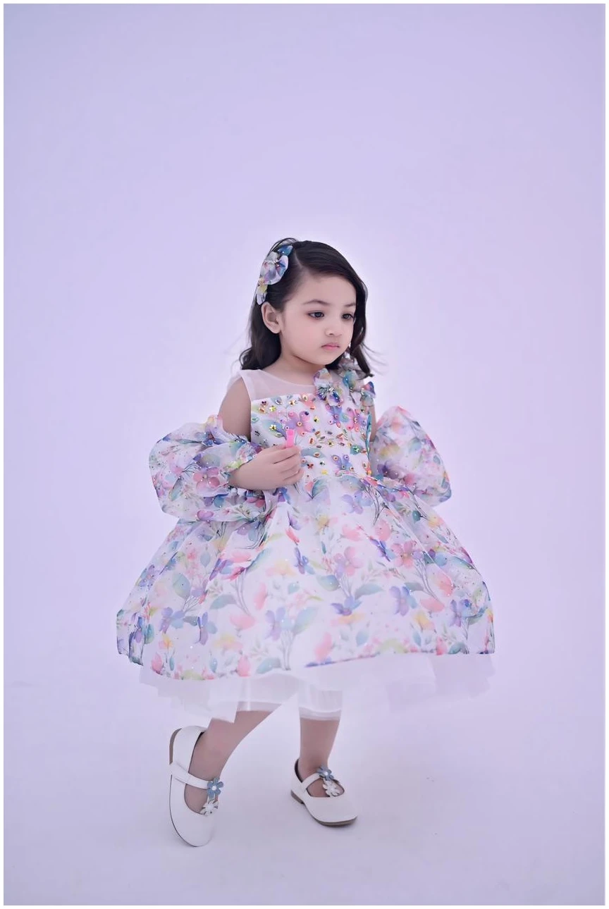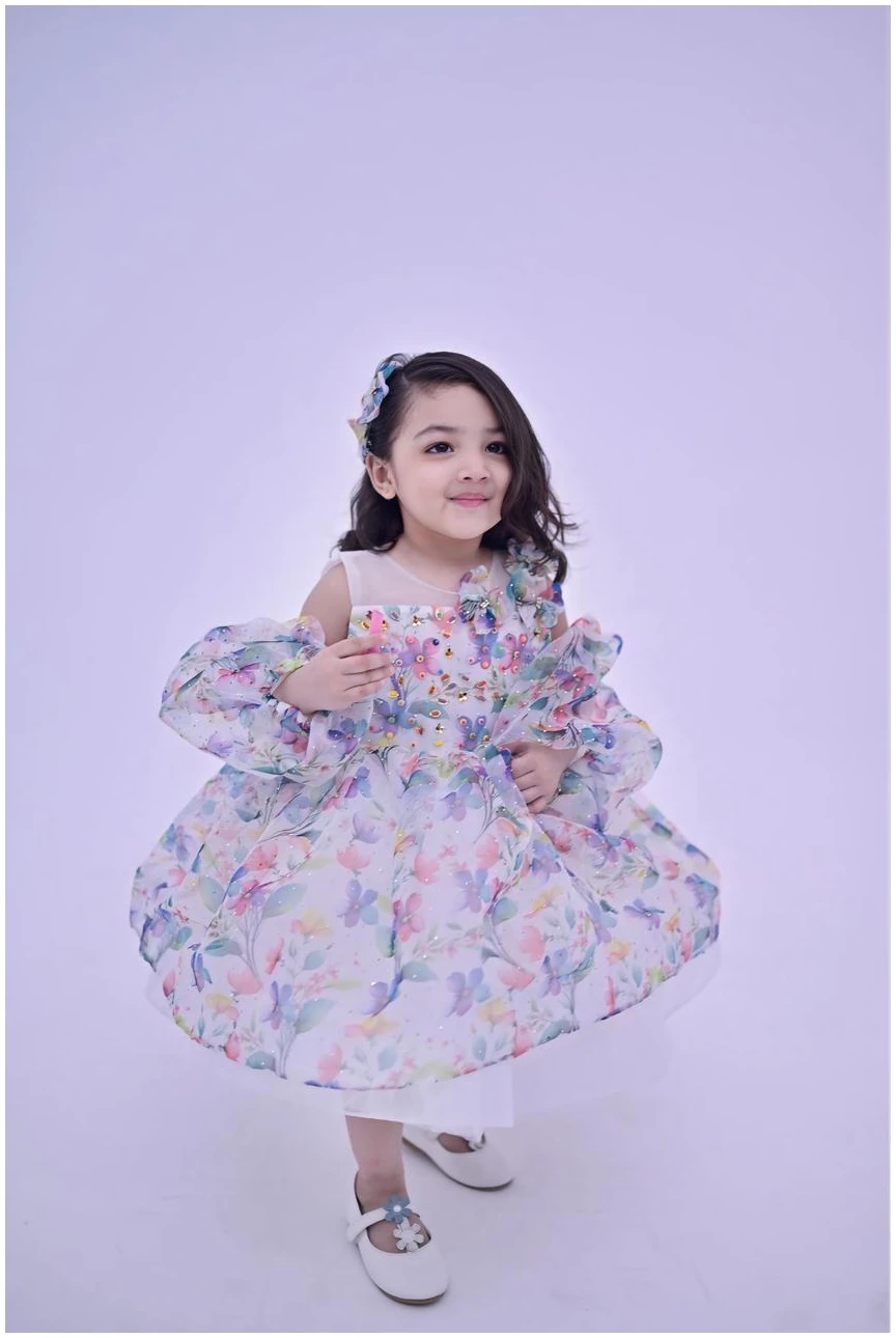 Add a touch of glamour to your wardrobe with this beautiful printed organza short frock, featuring delicate beading and a show-stopping back bow. 💎