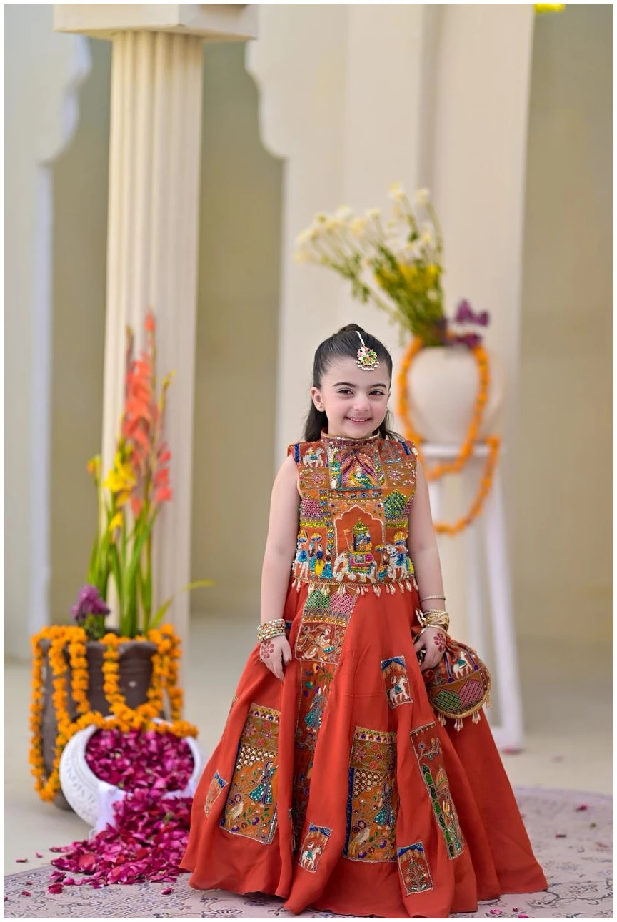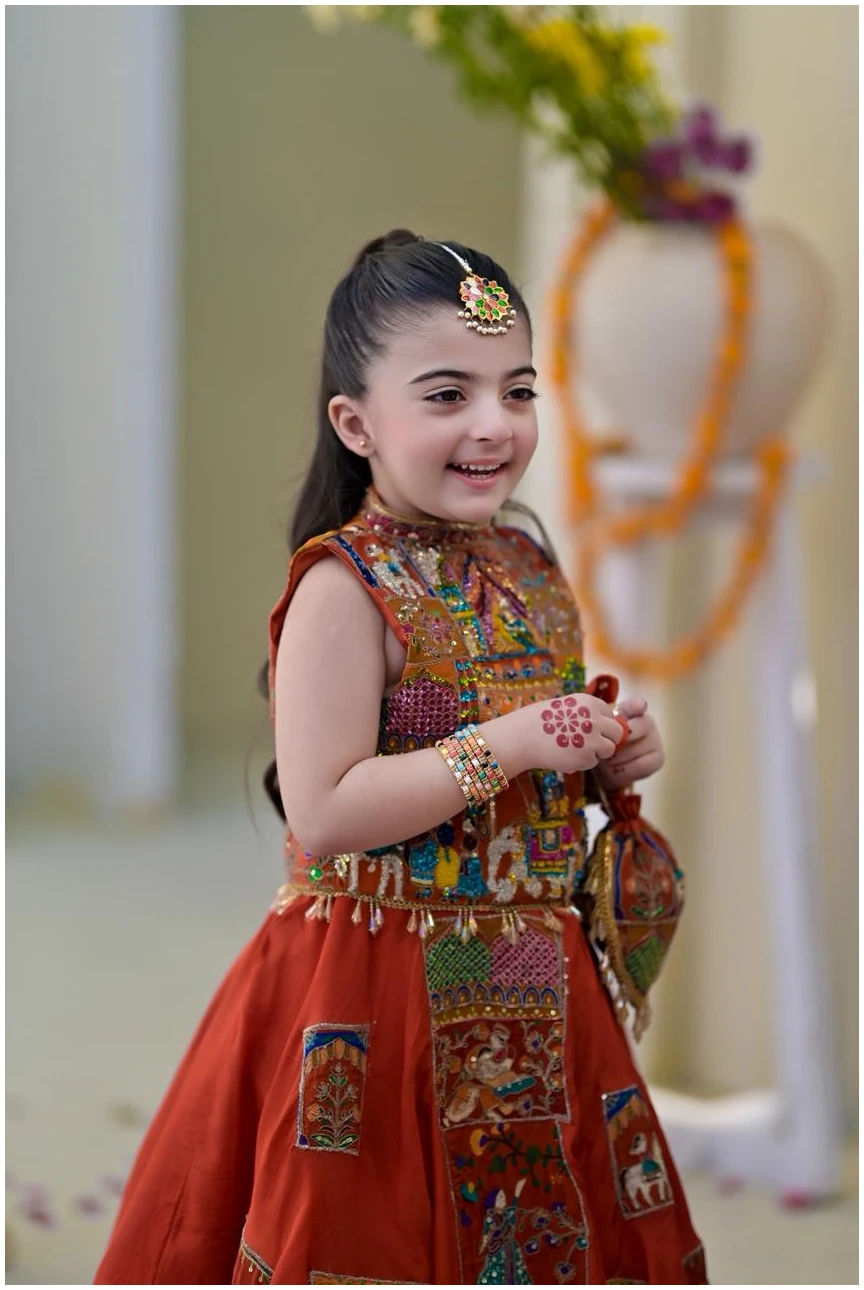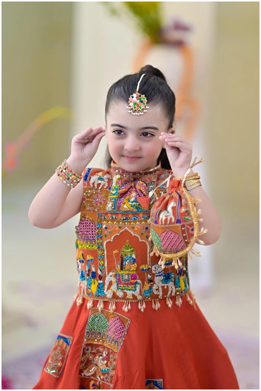 Bring festive charm to your little one’s wardrobe with our Handcrafted Traditional “ Lehnga Choli, a masterpiece inspired by vibrant South Asian culture. This stunning outfit features a bright mustard base adorned with intricate hand-embroidered , sequins, and multicolored thread detailing. Each patch tells a story — from royal processions to floral motifs — creating a rich, heritage-inspired look that feels both playful and regal. the flowy lehnga showcases fully embellished storytelling panels that add movement and festive sparkle. Soft, breathable fabric ensures comfort for long events, photoshoots, mehndi functions, cultural days, or weddings. Perfect for moms looking for a unique, artisan-crafted outfit that stands out in every crowd.