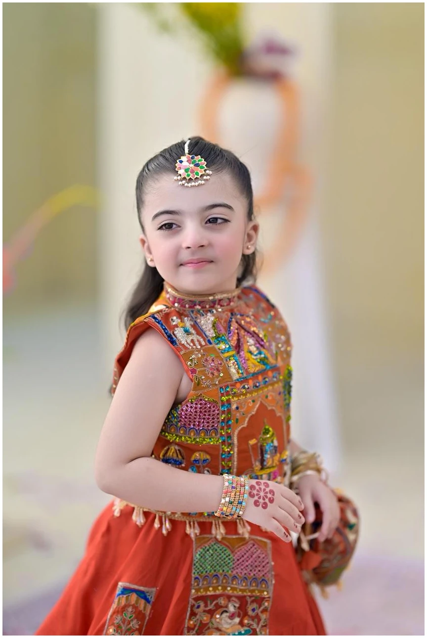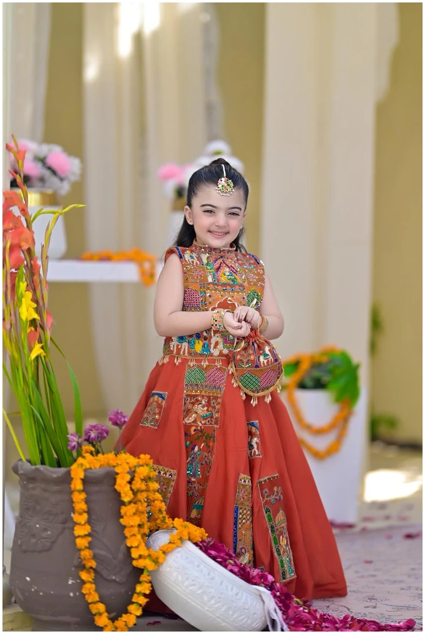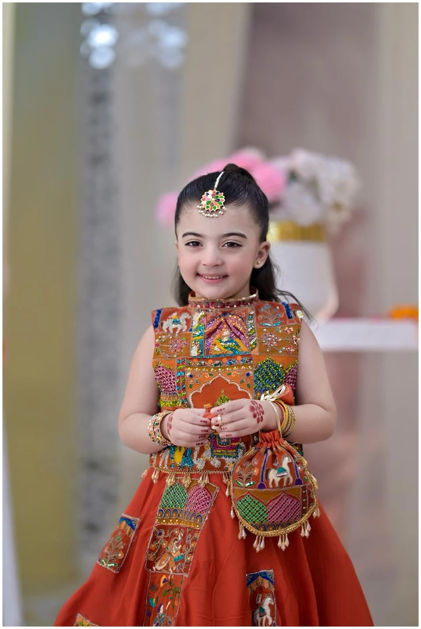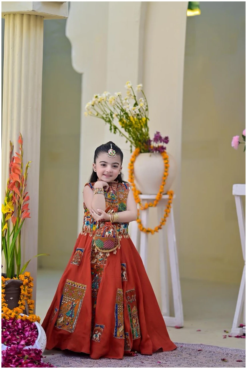 Bring festive charm to your little one’s wardrobe with our Handcrafted Traditional “ Lehnga Choli, a masterpiece inspired by vibrant South Asian culture. This stunning outfit features a bright mustard base adorned with intricate hand-embroidered , sequins, and multicolored thread detailing. Each patch tells a story — from royal processions to floral motifs — creating a rich, heritage-inspired look that feels both playful and regal. the flowy lehnga showcases fully embellished storytelling panels that add movement and festive sparkle. Soft, breathable fabric ensures comfort for long events, photoshoots, mehndi functions, cultural days, or weddings. Perfect for moms looking for a unique, artisan-crafted outfit that stands out in every crowd.