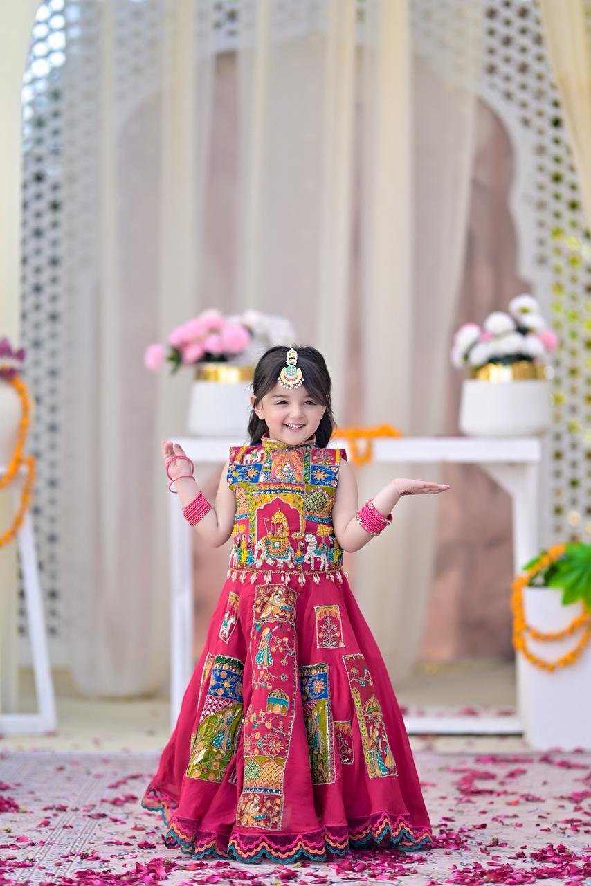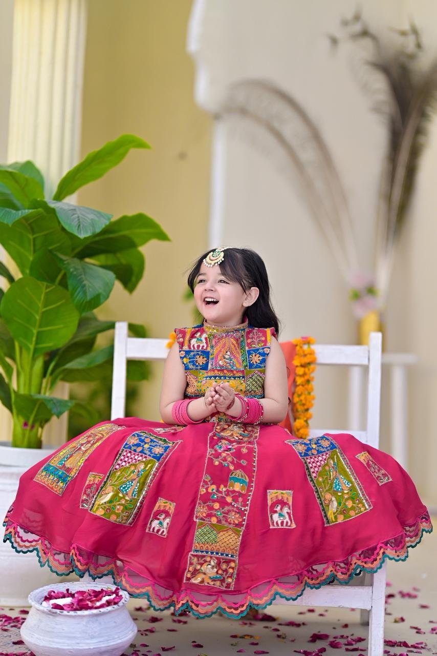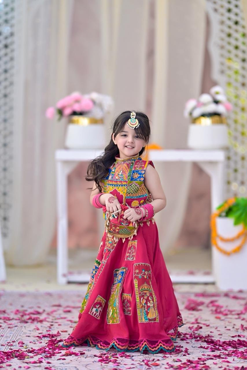 Bring festive charm to your little one’s wardrobe with our Handcrafted Traditional “ Lehnga Choli, a masterpiece inspired by vibrant South Asian culture. This stunning outfit features a bright mustard base adorned with intricate hand-embroidered , sequins, and multicolored thread detailing.