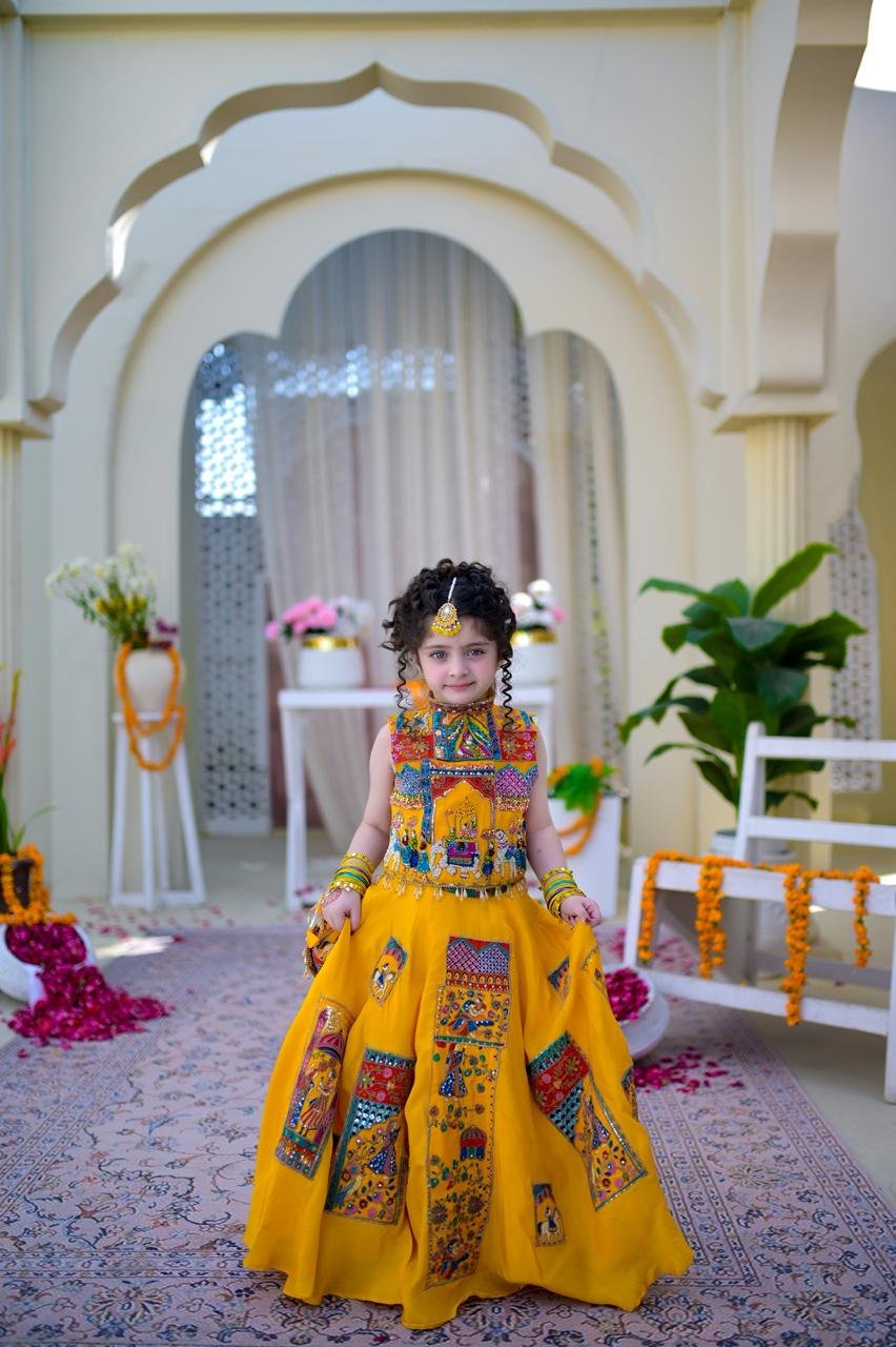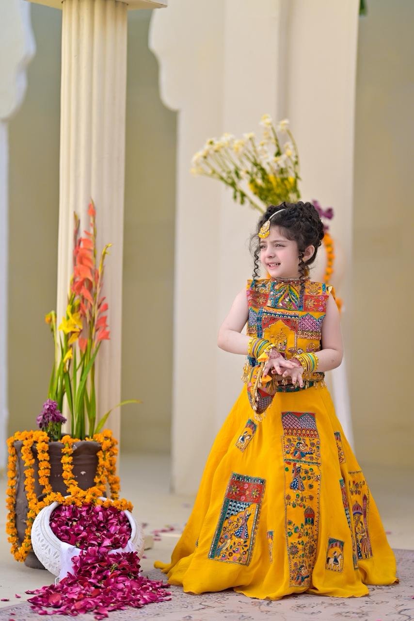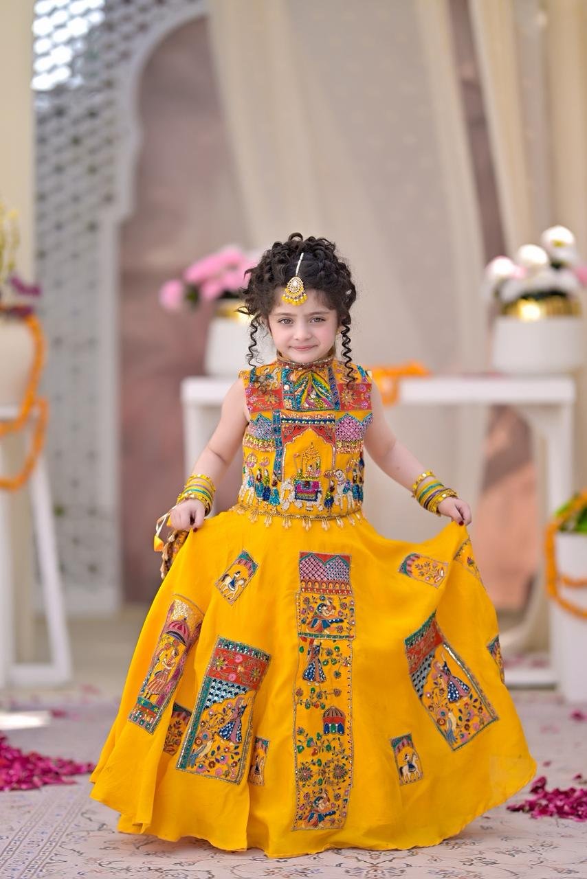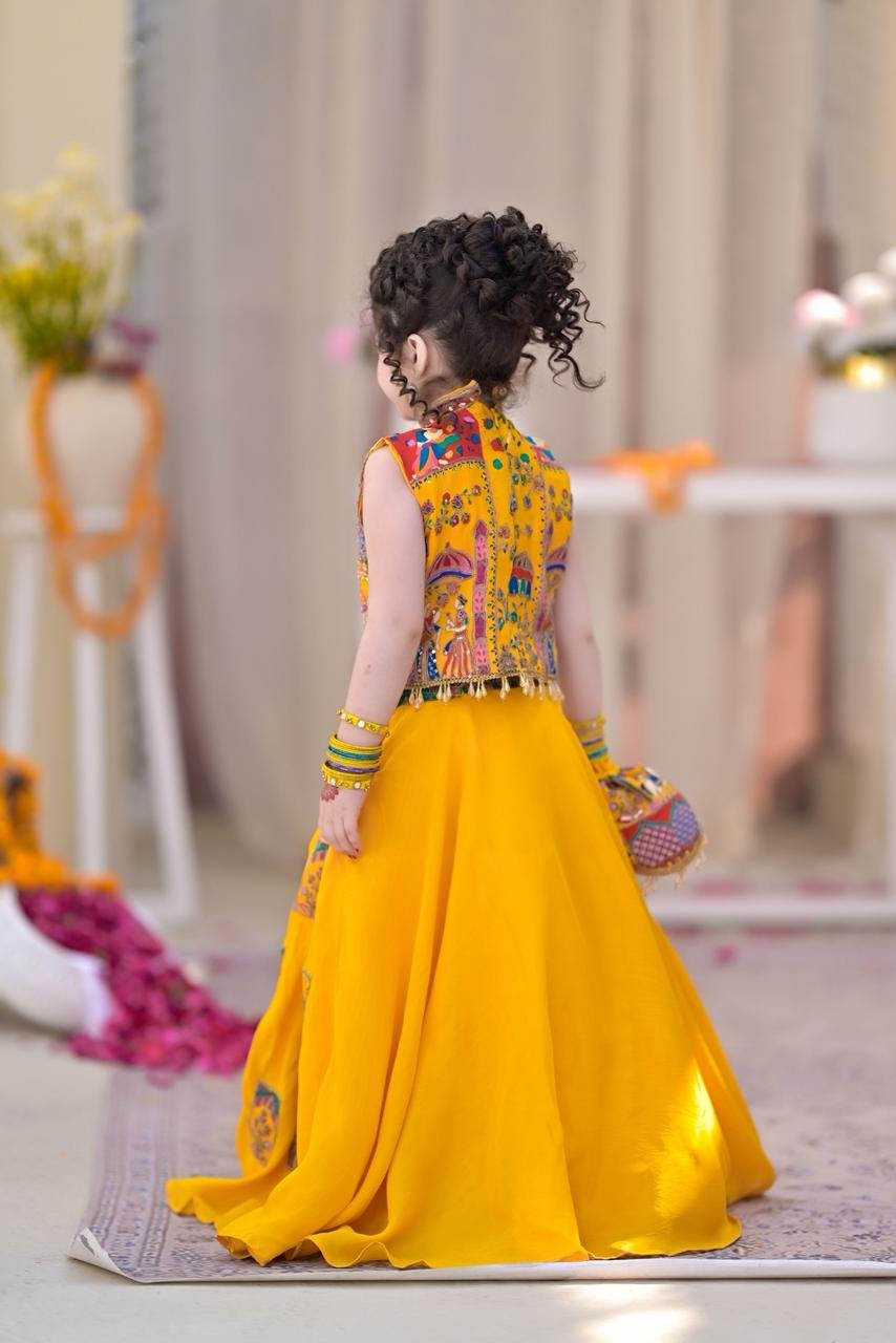 Bring festive charm to your little one’s wardrobe with our Handcrafted Traditional “ Lehnga Choli, a masterpiece inspired by vibrant South Asian culture. This stunning outfit features a bright mustard base adorned with intricate hand-embroidered , sequins, and multicolored thread detailing.