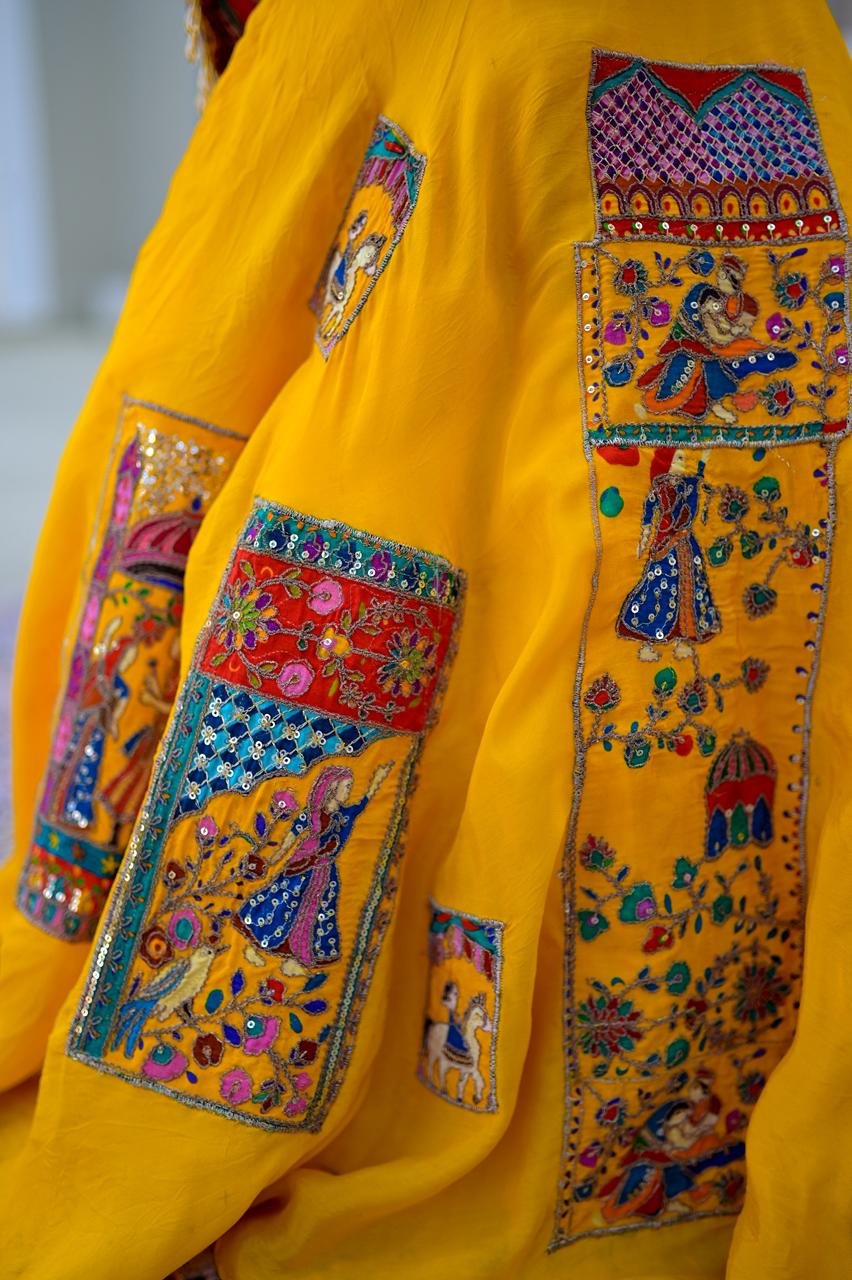 Each patch tells a story — from royal processions to floral motifs — creating a rich, heritage-inspired look that feels both playful and regal.