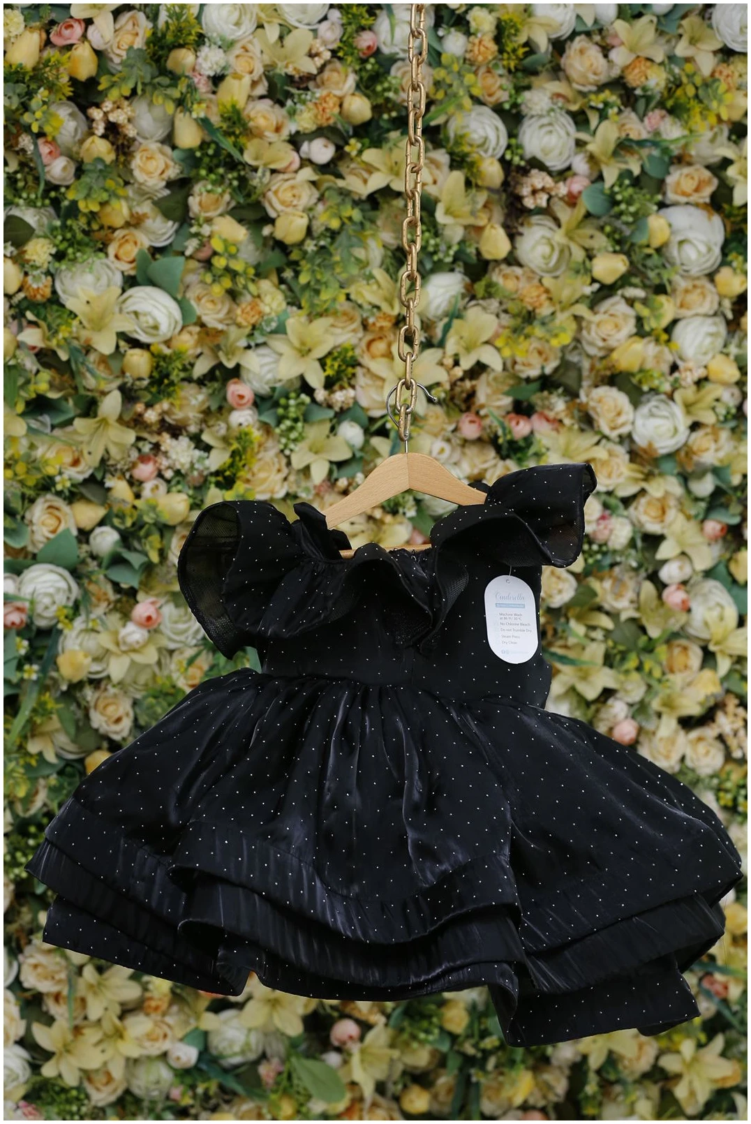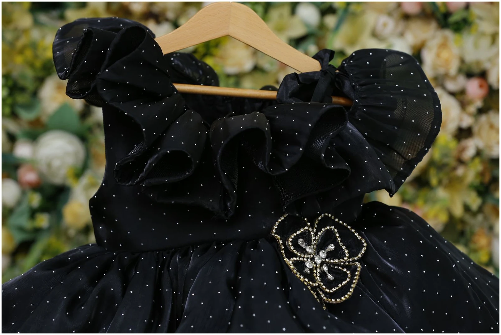 Make your little one shine with this stunning black party frock, designed to bring elegance and charm to any occasion. Crafted from premium fabric, this frock features delicate silver polka dots, playful ruffled shoulders, and a beautifully layered skirt that adds volume and flair. The highlight of the dress is the embellished floral brooch on the waist, giving it a touch of sparkle and sophistication.
