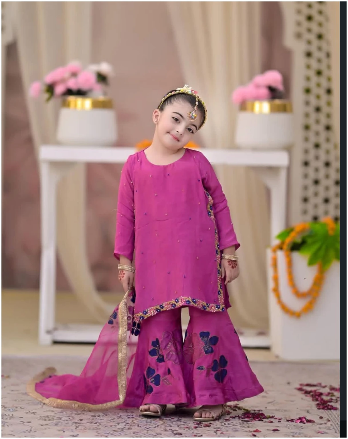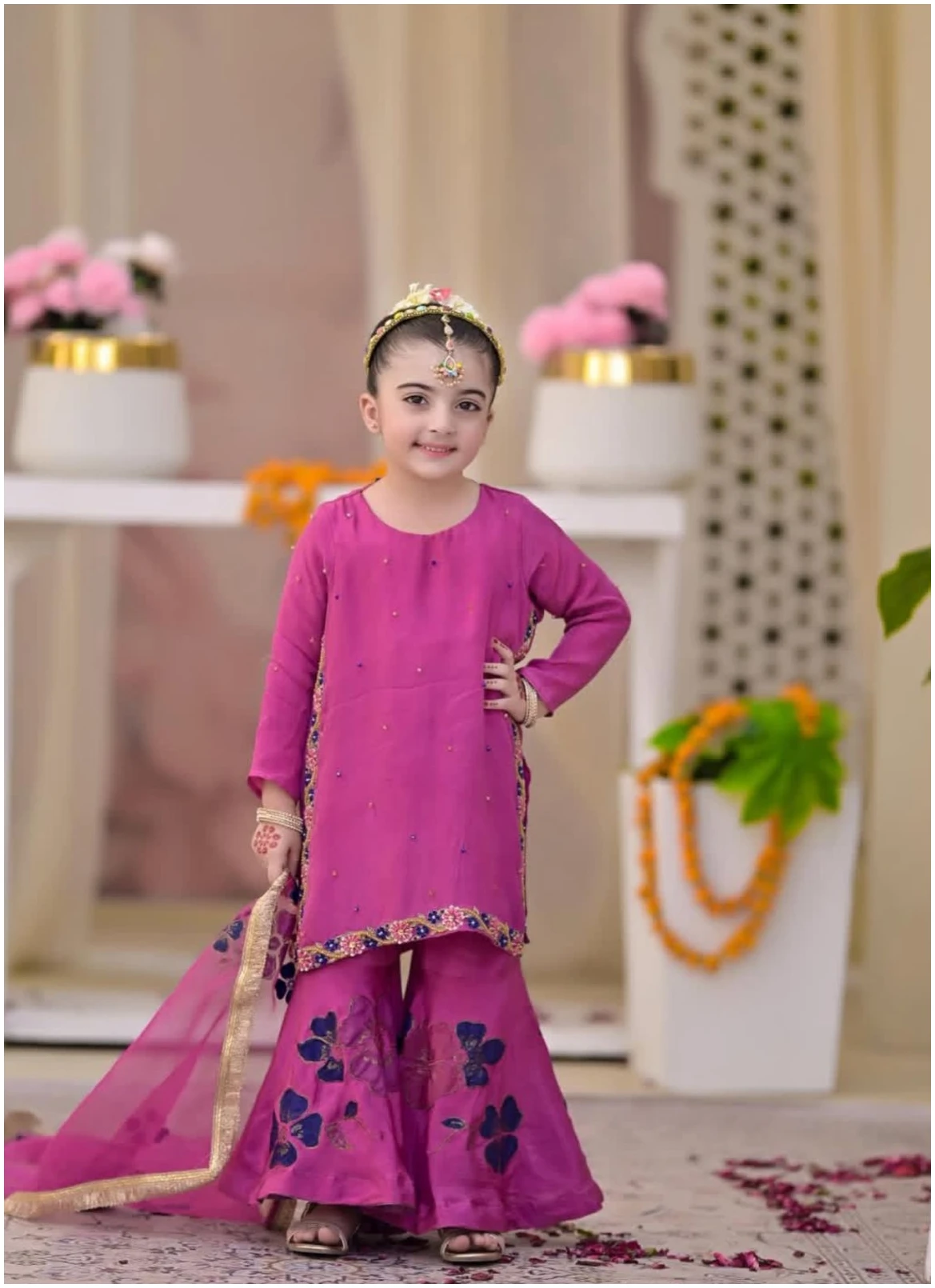 Add a touch of festive charm to your little one’s wardrobe with our Sharara Set. Crafted in a rich fuchsia pink hue, this elegant 3-piece traditional outfit features a straight-cut shirt adorned with delicate hand embellishments and a beautifully embroidered border. The flowy sharara is enhanced with graceful floral motifs, creating a playful yet regal silhouette. Paired with a soft net dupatta finished with subtle gold edging, this ensemble offers both comfort and timeless elegance.Perfect for mehndi, dholki, festive celebrations, birthdays, and traditional photoshoots, this outfit is designed to make your little princess shine with effortless grace.